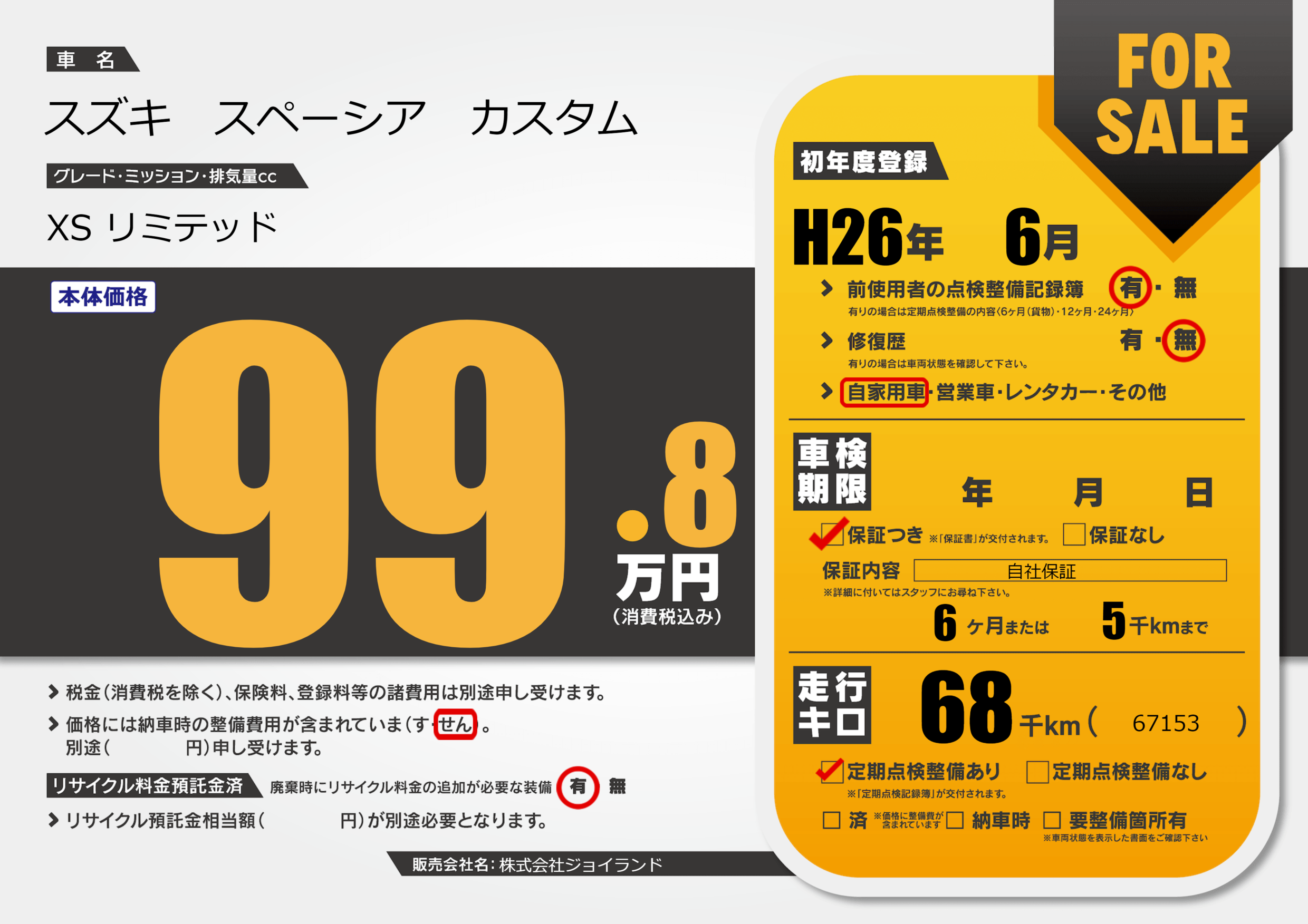 | 車名 | スズキ スペーシア カスタム | グレード ミッション 排気量 |
