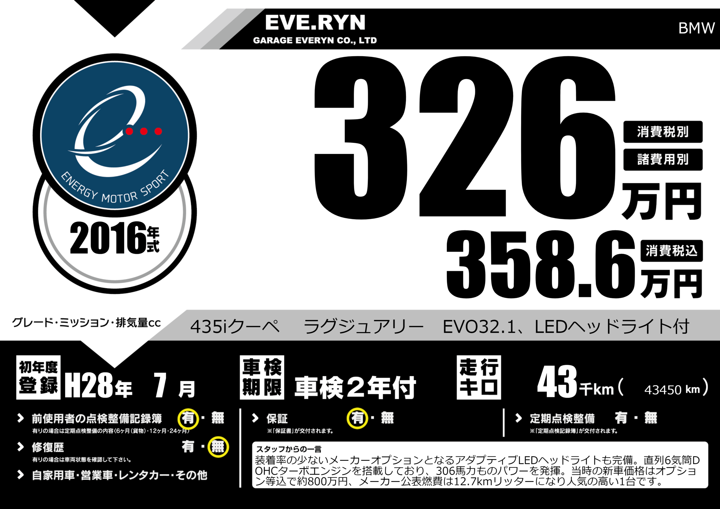 435iクーペ ラグジュアリー EVO32.1、LEDヘッドライト付 |
