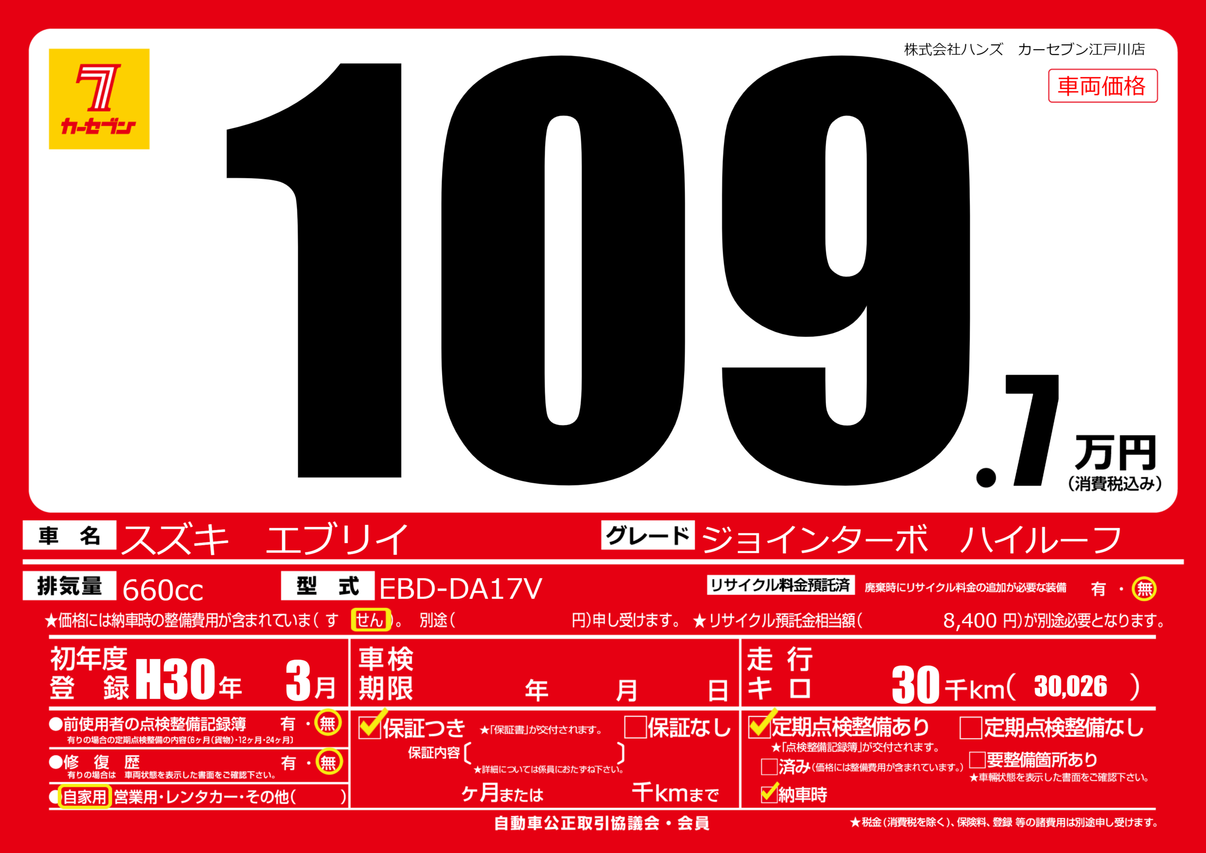 | 走行キロ | 3万km | 初年度登録 | H30年3月 |