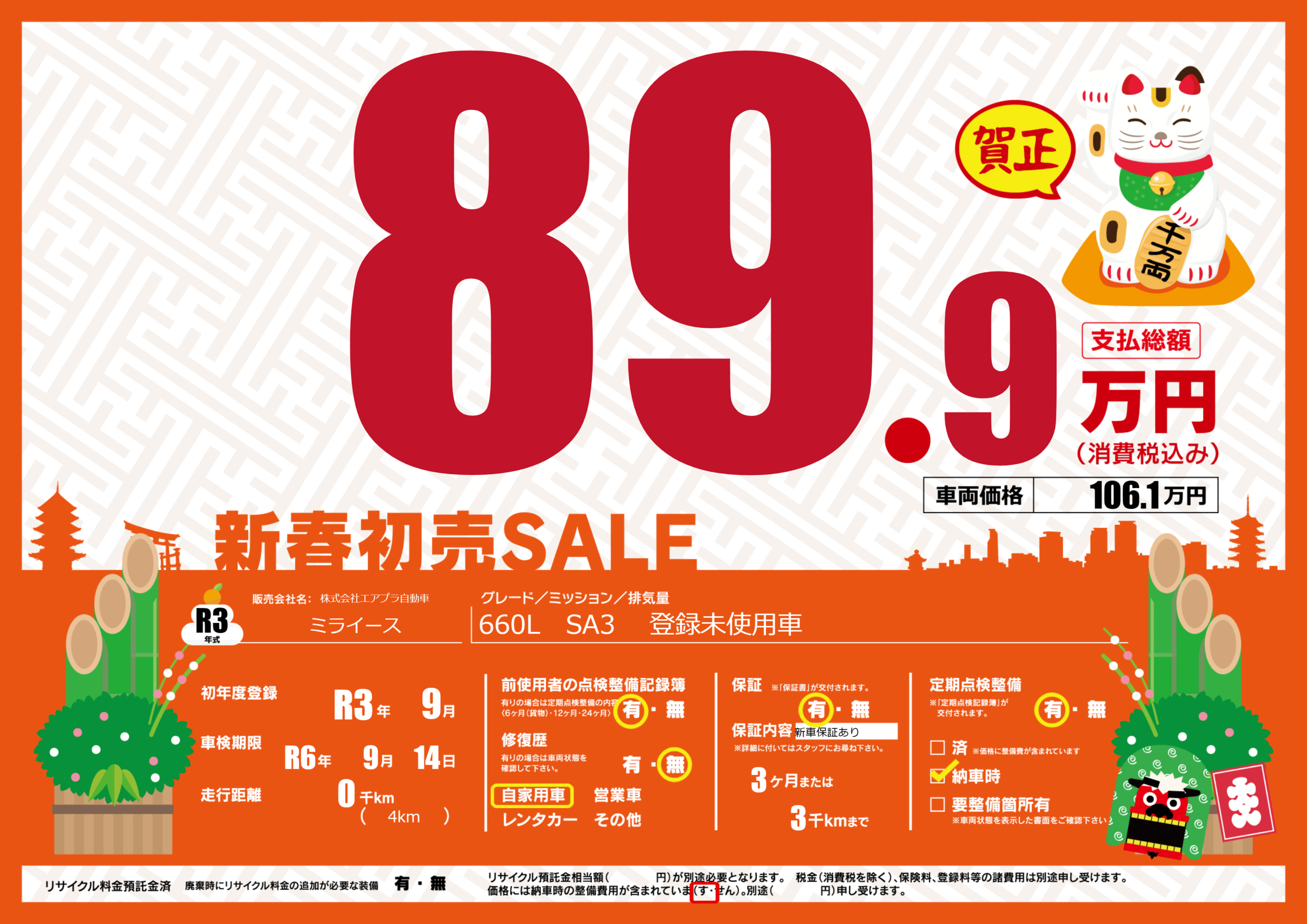 保証付き 保証内容(新車保証あり) 3ヶ月または3千km |