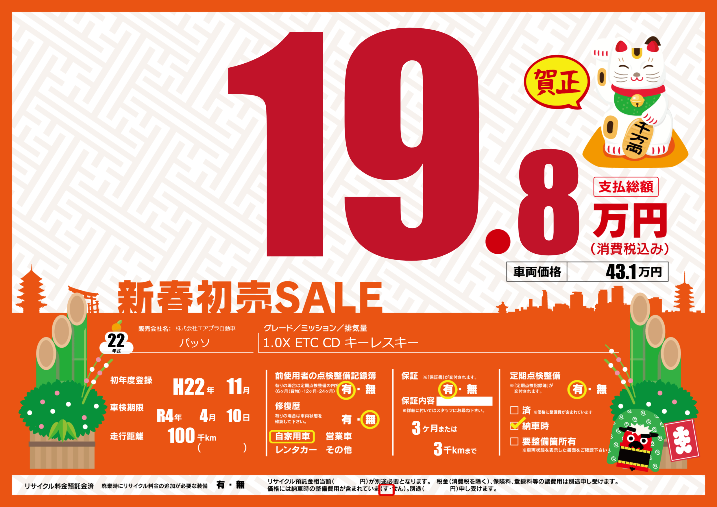 | 定期点検整備 | 定期点検整備あり 納車時あり | ||