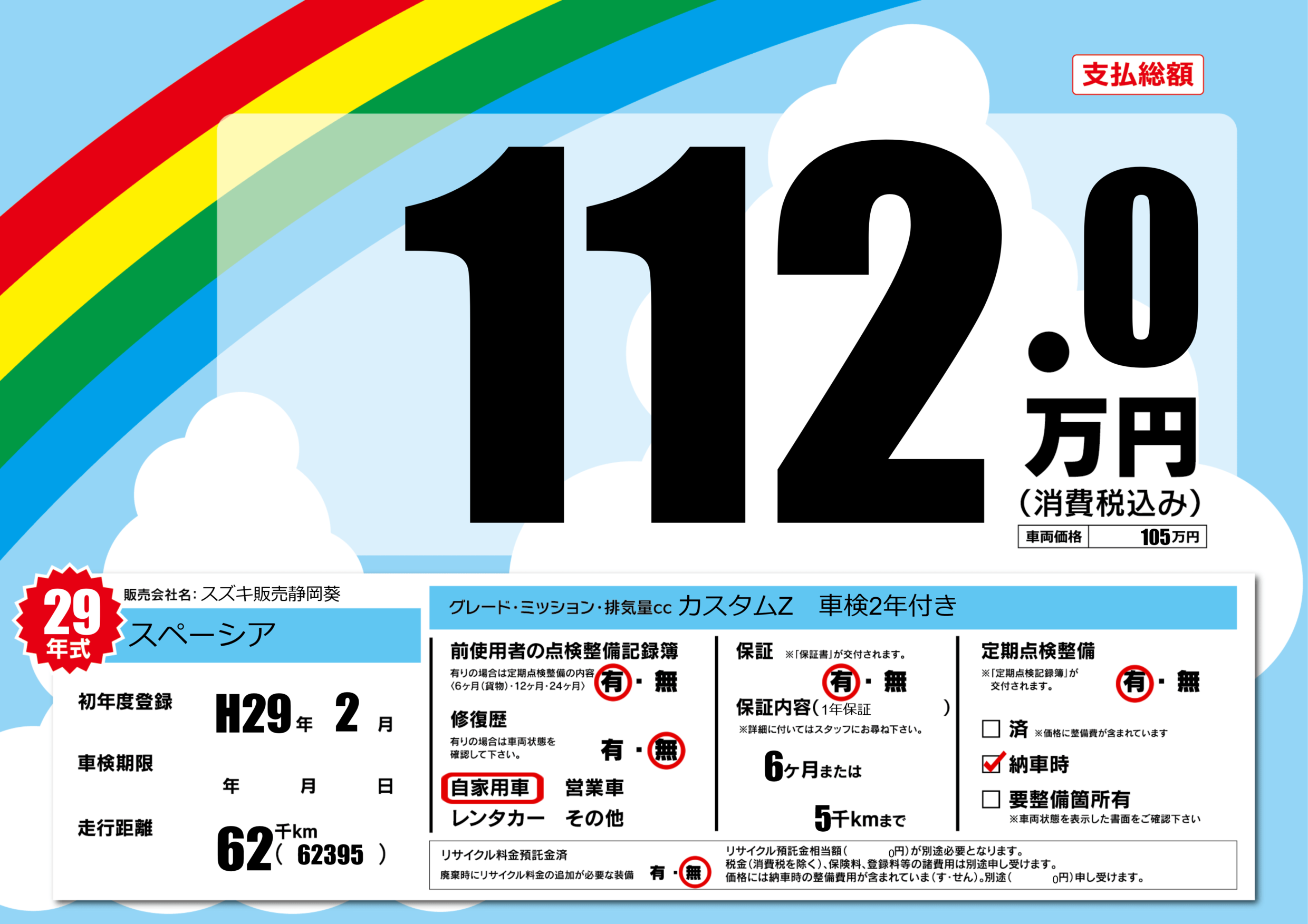 | 走行キロ | 6.2万km | 初年度登録 | H29年2月 |