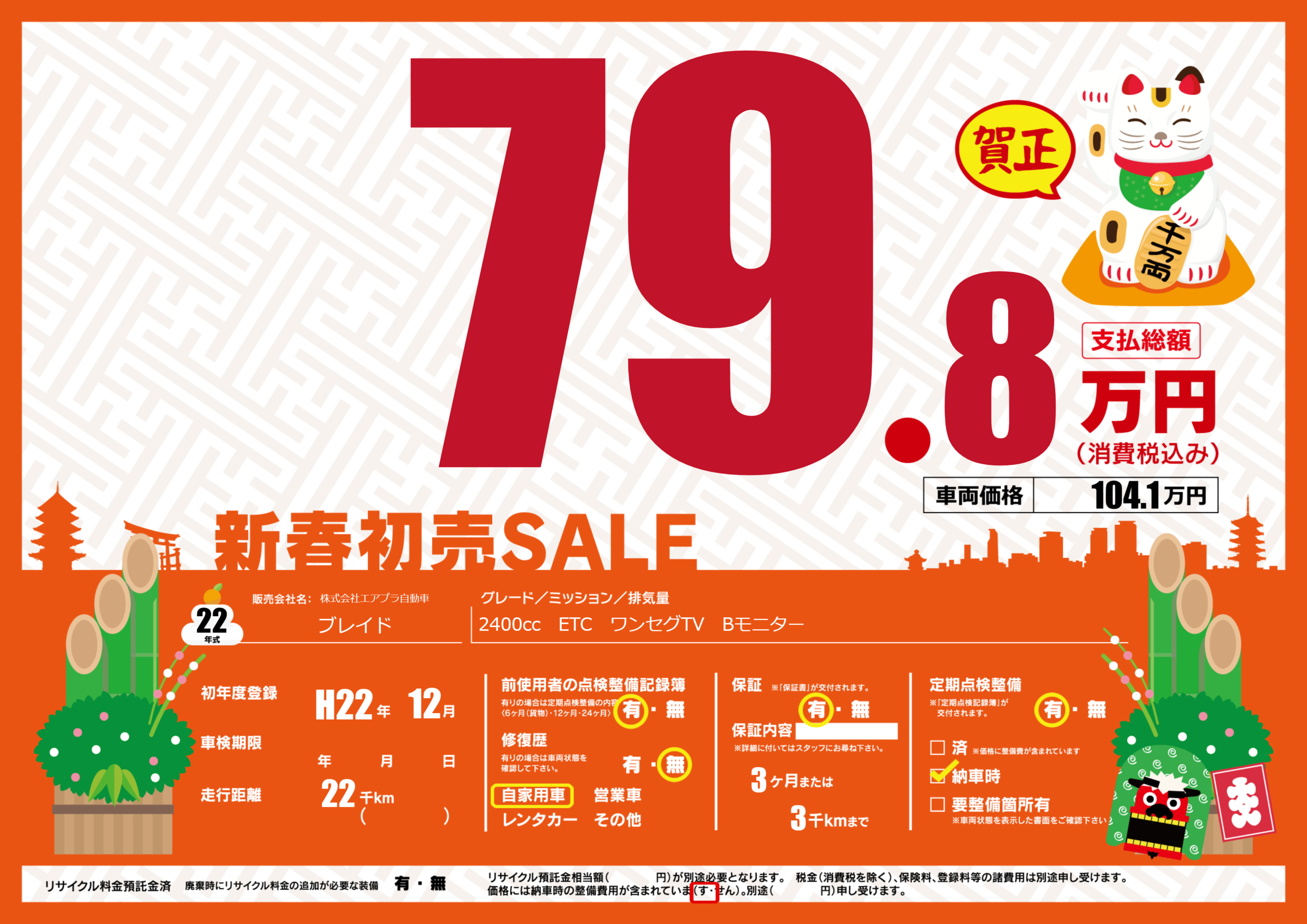 | 定期点検整備 | 定期点検整備あり 納車時あり | ||