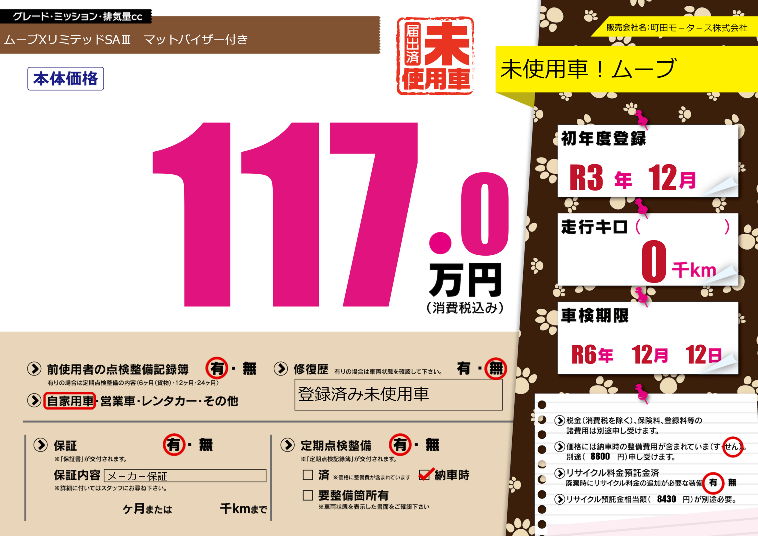 | 車名 | 未使用車!ムーブ | グレード ミッション 排気量 |