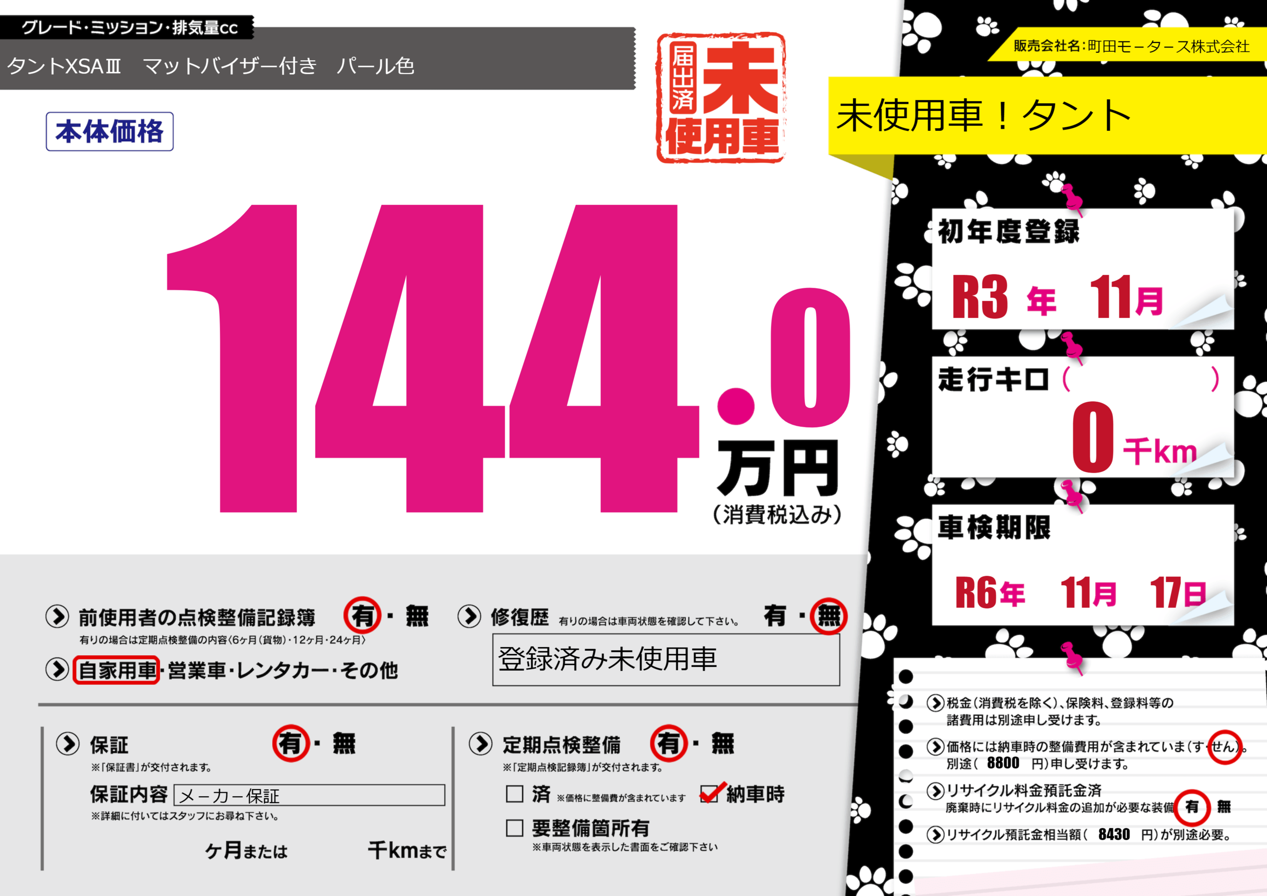 | 車名 | 未使用車!タント | グレード ミッション 排気量 |