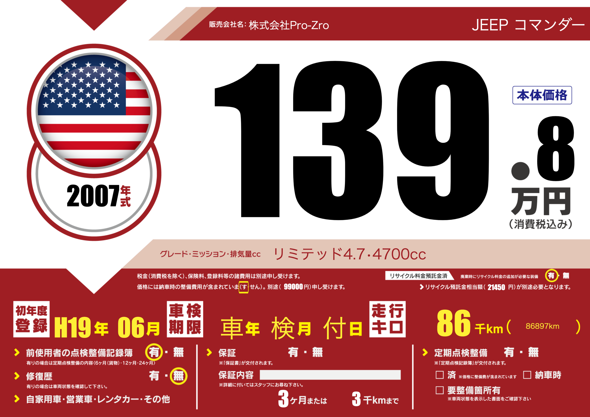 | 車名 | JEEP コマンダー | グレード ミッション 排気量 |
