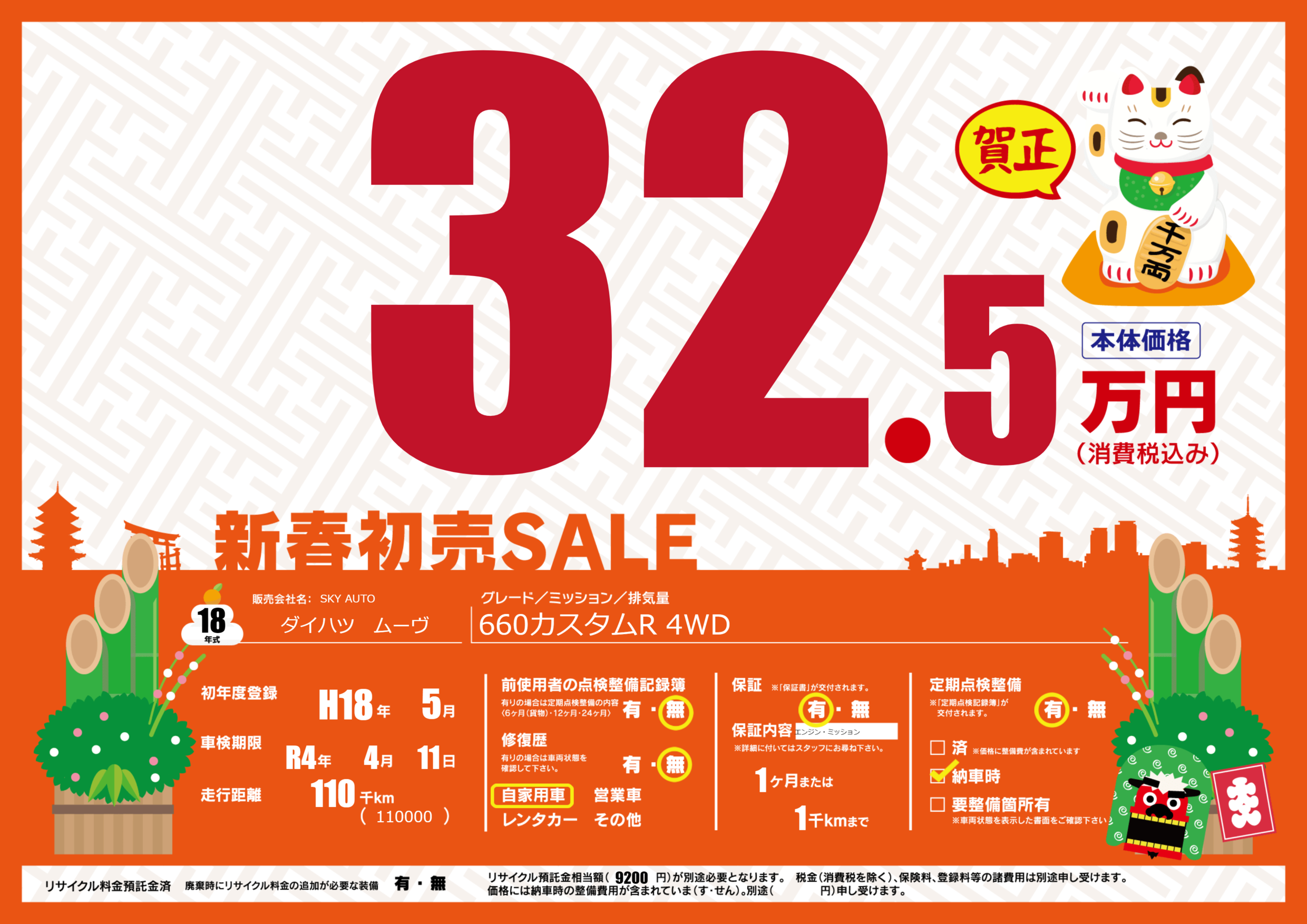| 走行キロ | 11万km | 初年度登録 | H18年5月 |