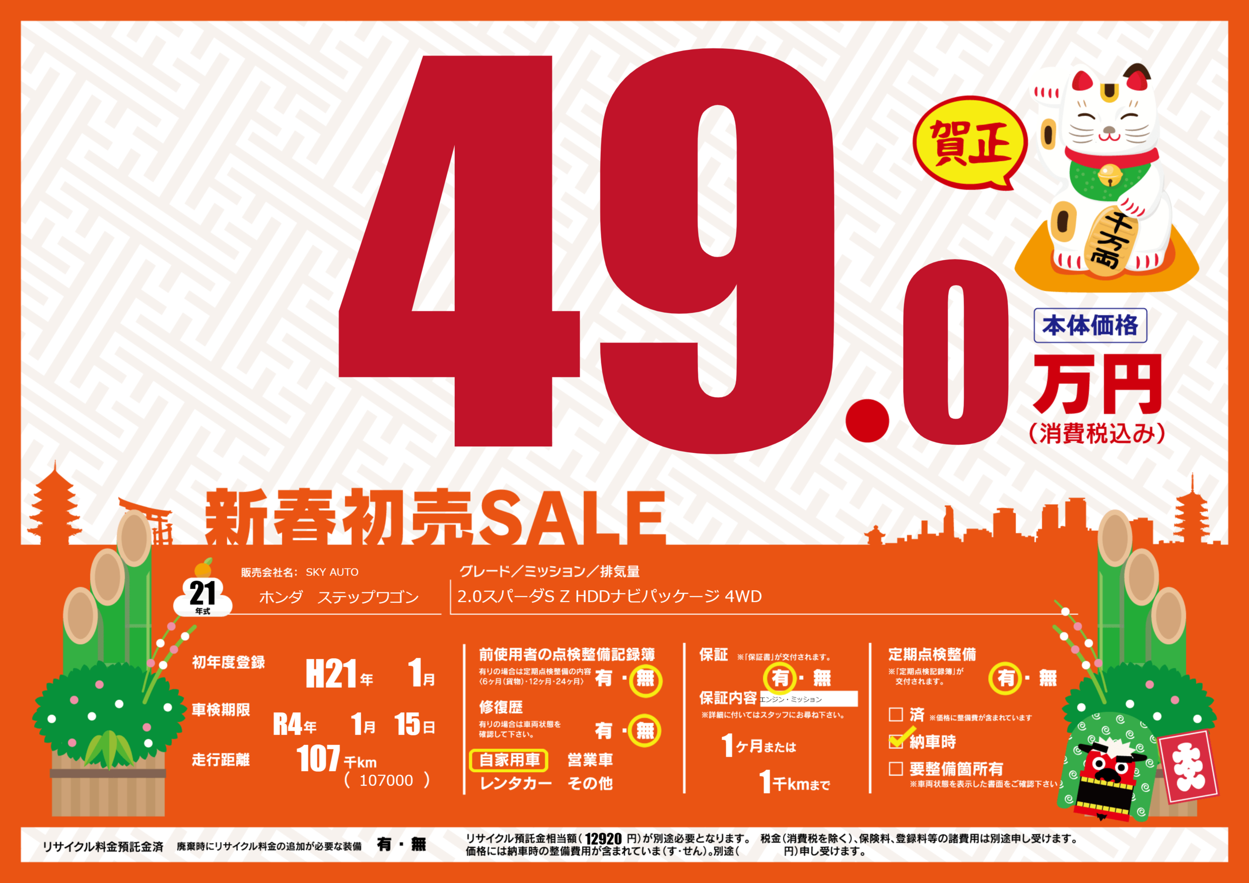 | 走行キロ | 10.7万km | 初年度登録 | H21年1月 |