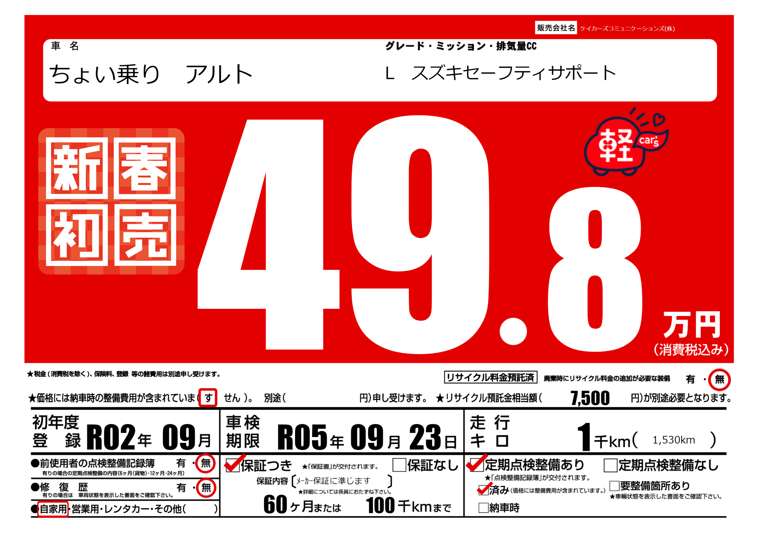 | 定期点検整備 | 定期点検整備あり 定期点検整備済み | ||