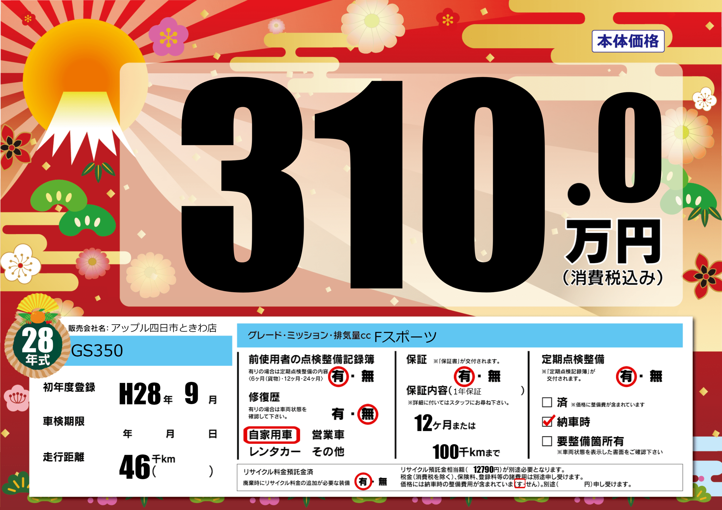保証付き 保証内容(1年保証) 12ヶ月または(100)千kmまで |