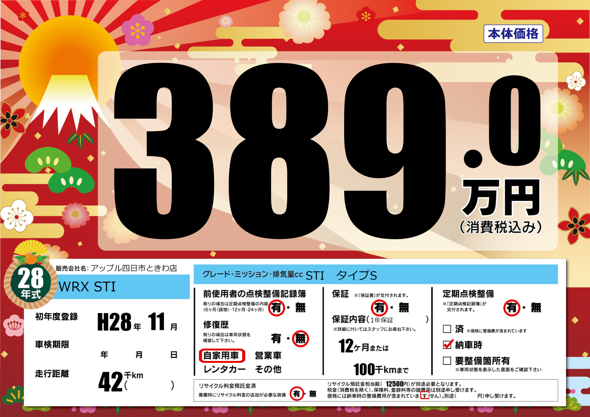 | 車名 | WRX STI | グレード ミッション 排気量 |