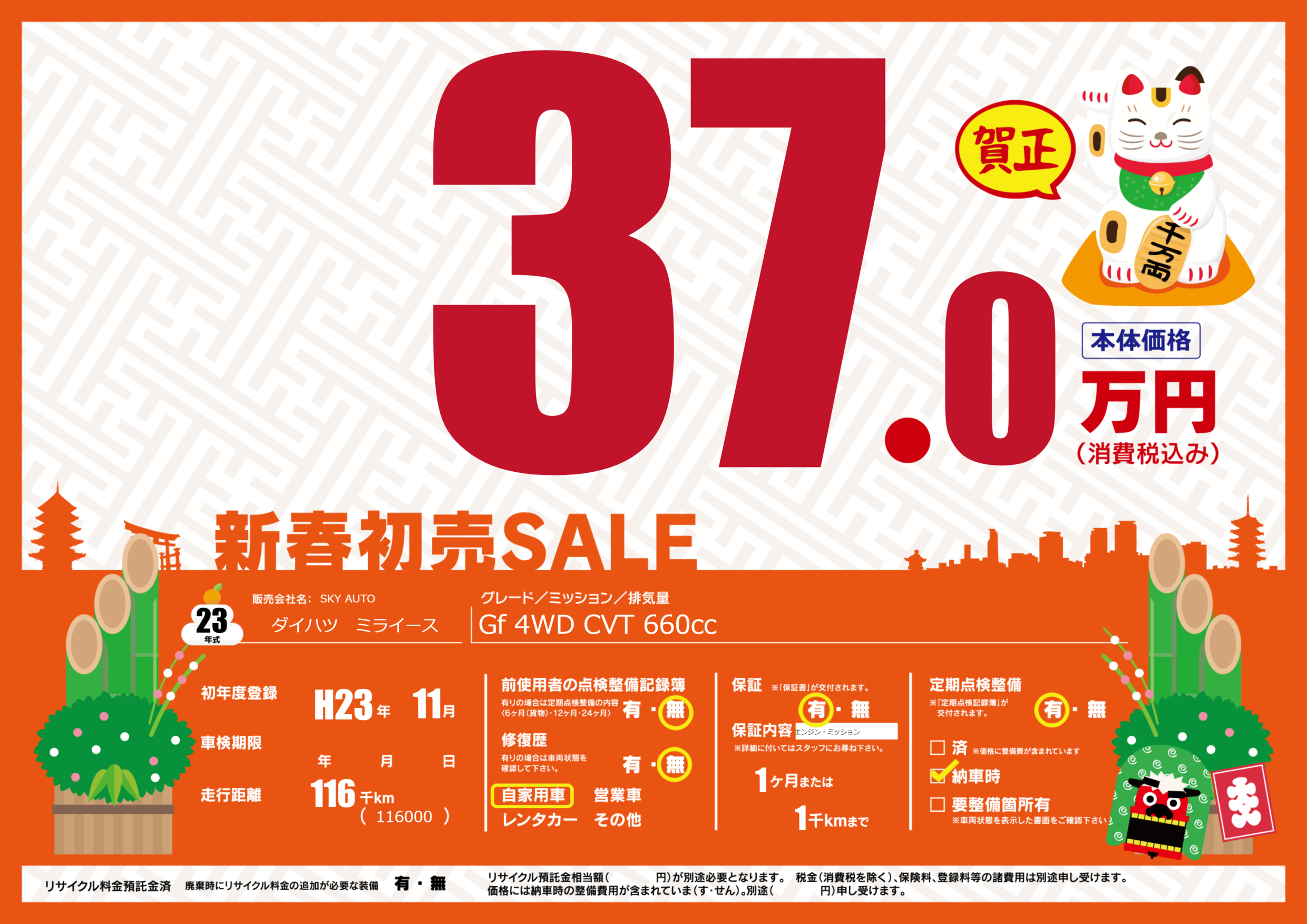 | 走行キロ | 11.6万km | 初年度登録 | H23年11月 |