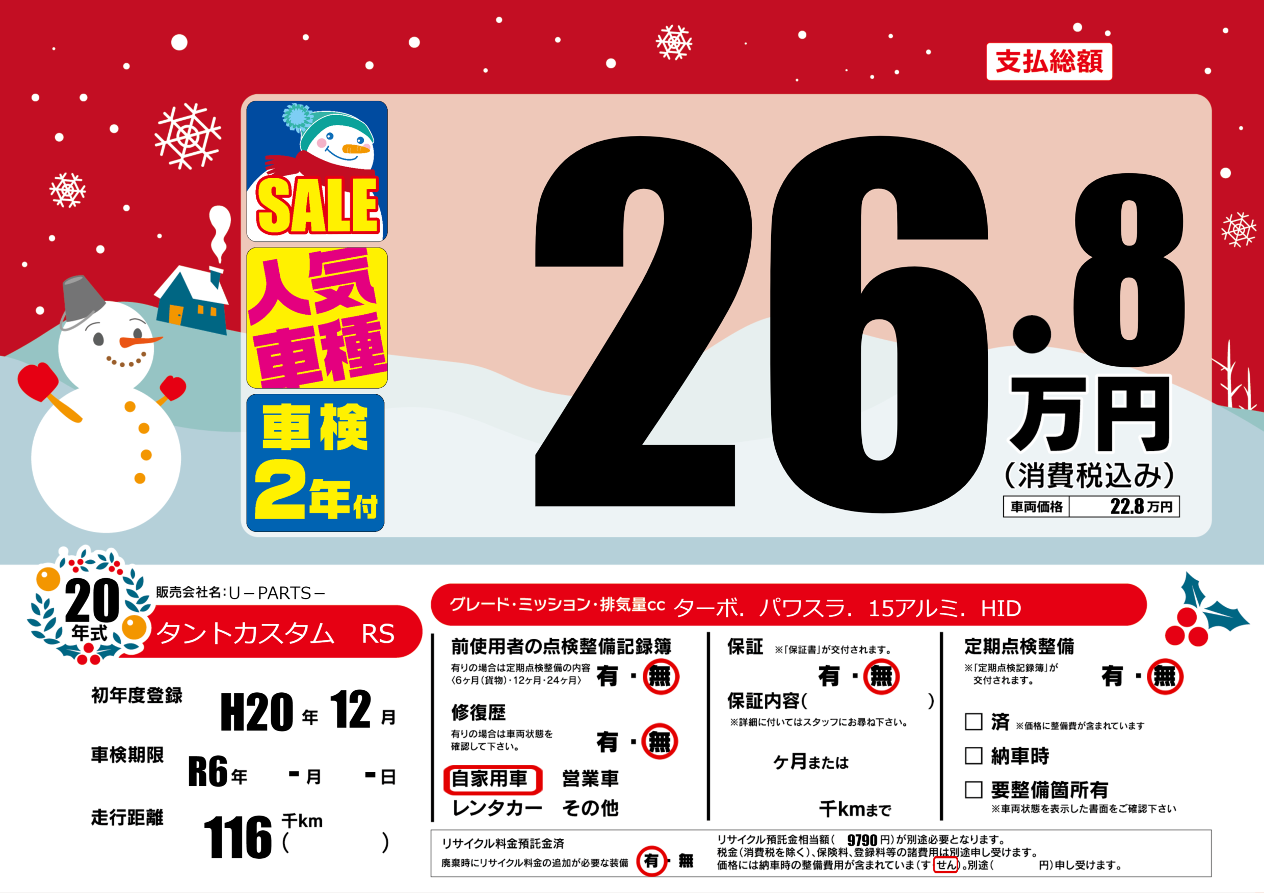 | 走行キロ | 11.6万km | 初年度登録 | H20年12月 |
