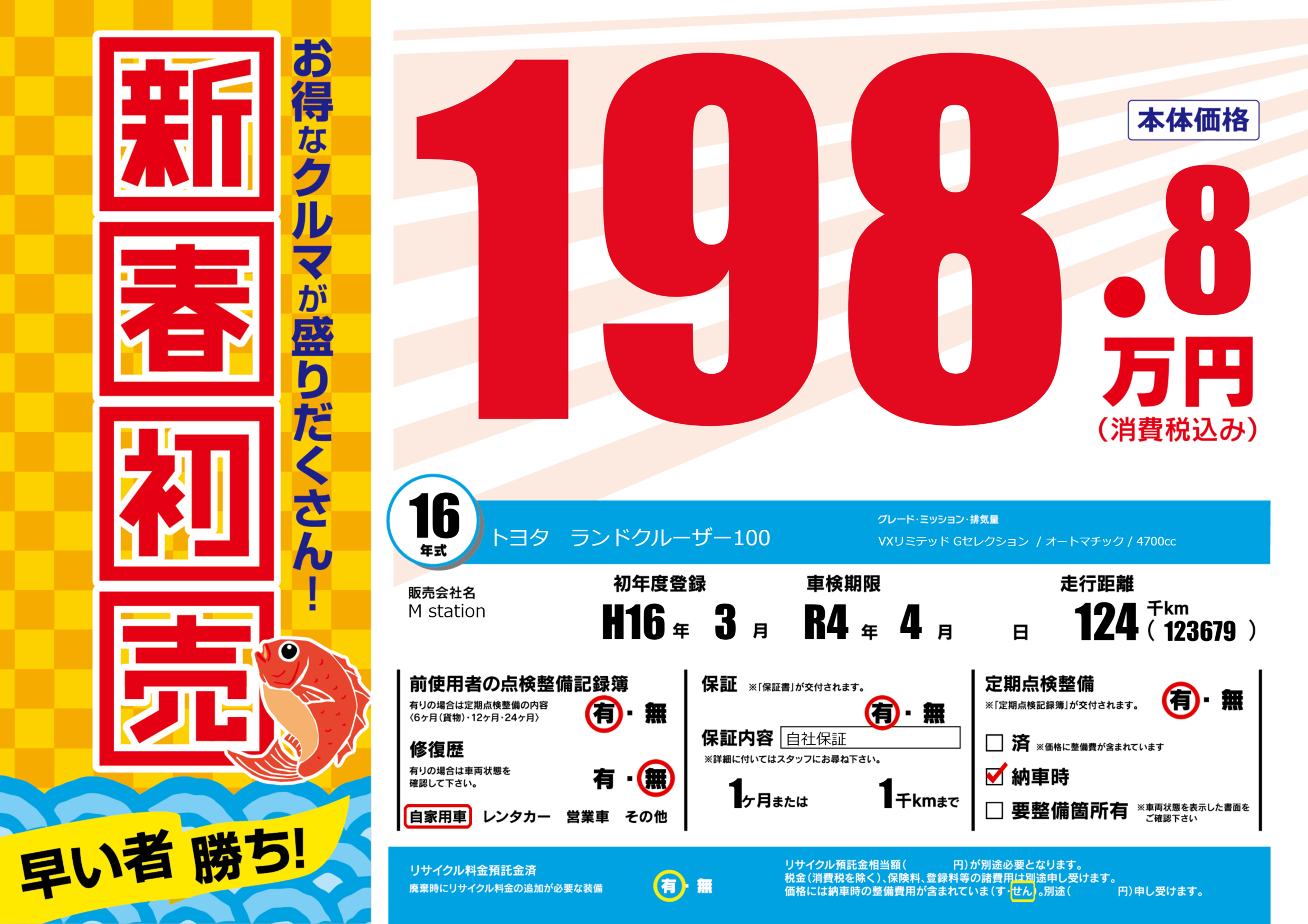 | 車名 | トヨタ ランドクルーザー100 | グレード ミッション 排気量 |