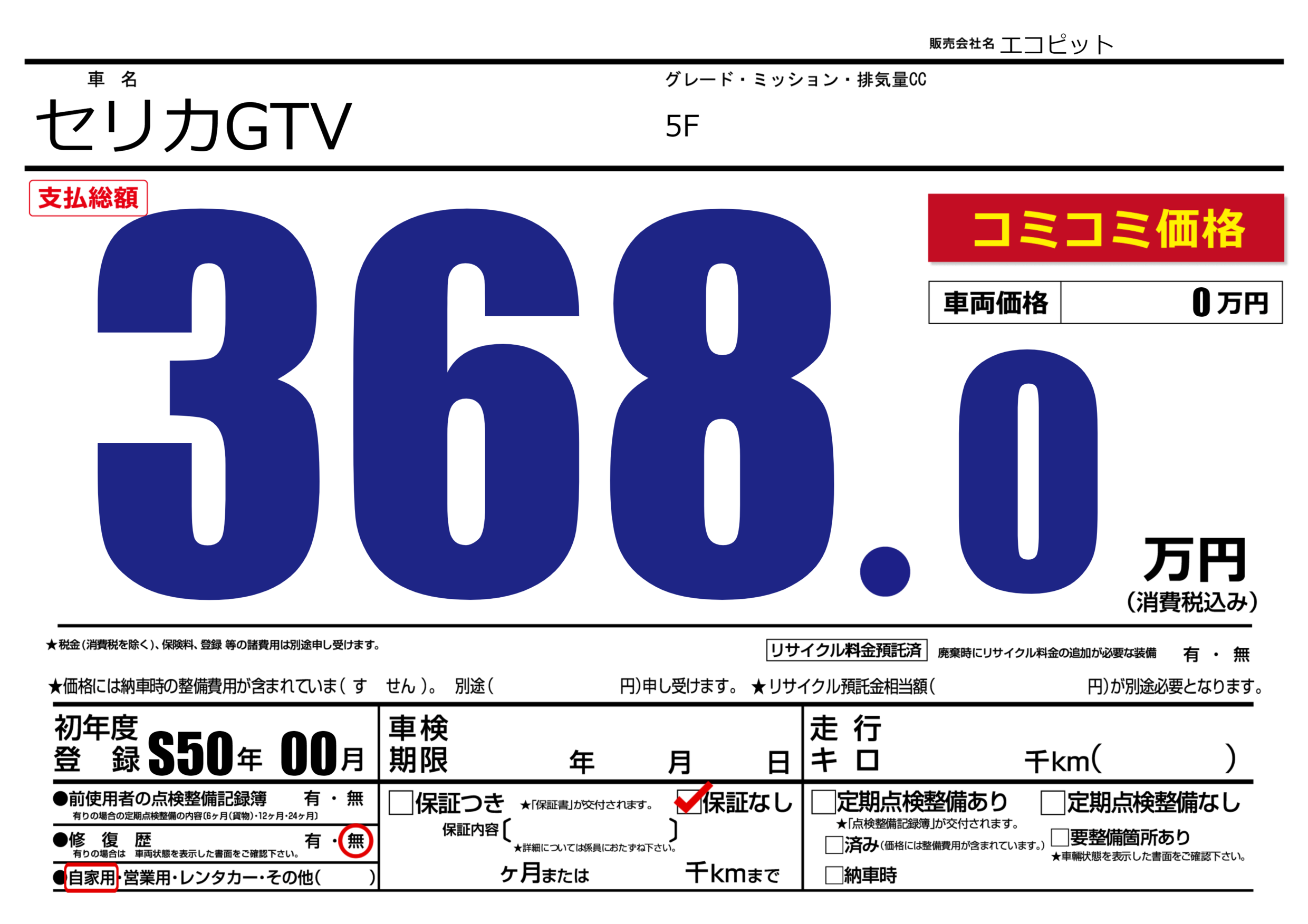 | 車名 | セリカGTV | グレード ミッション 排気量 |