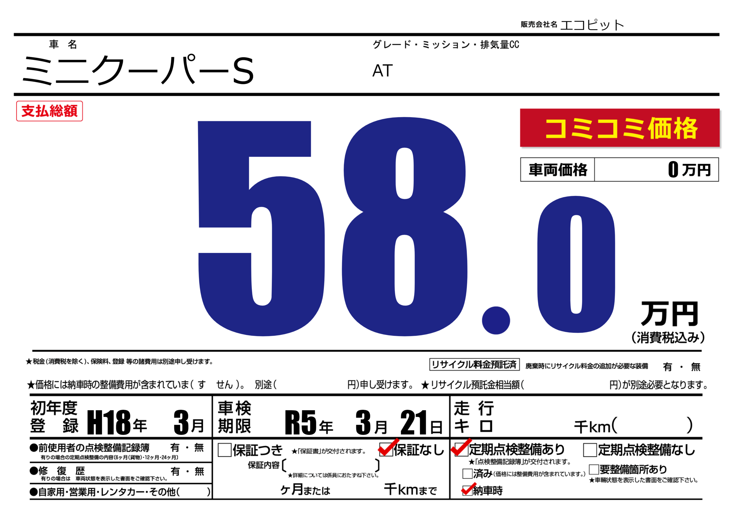 | 車名 | ミニクーパーS | グレード ミッション 排気量 |