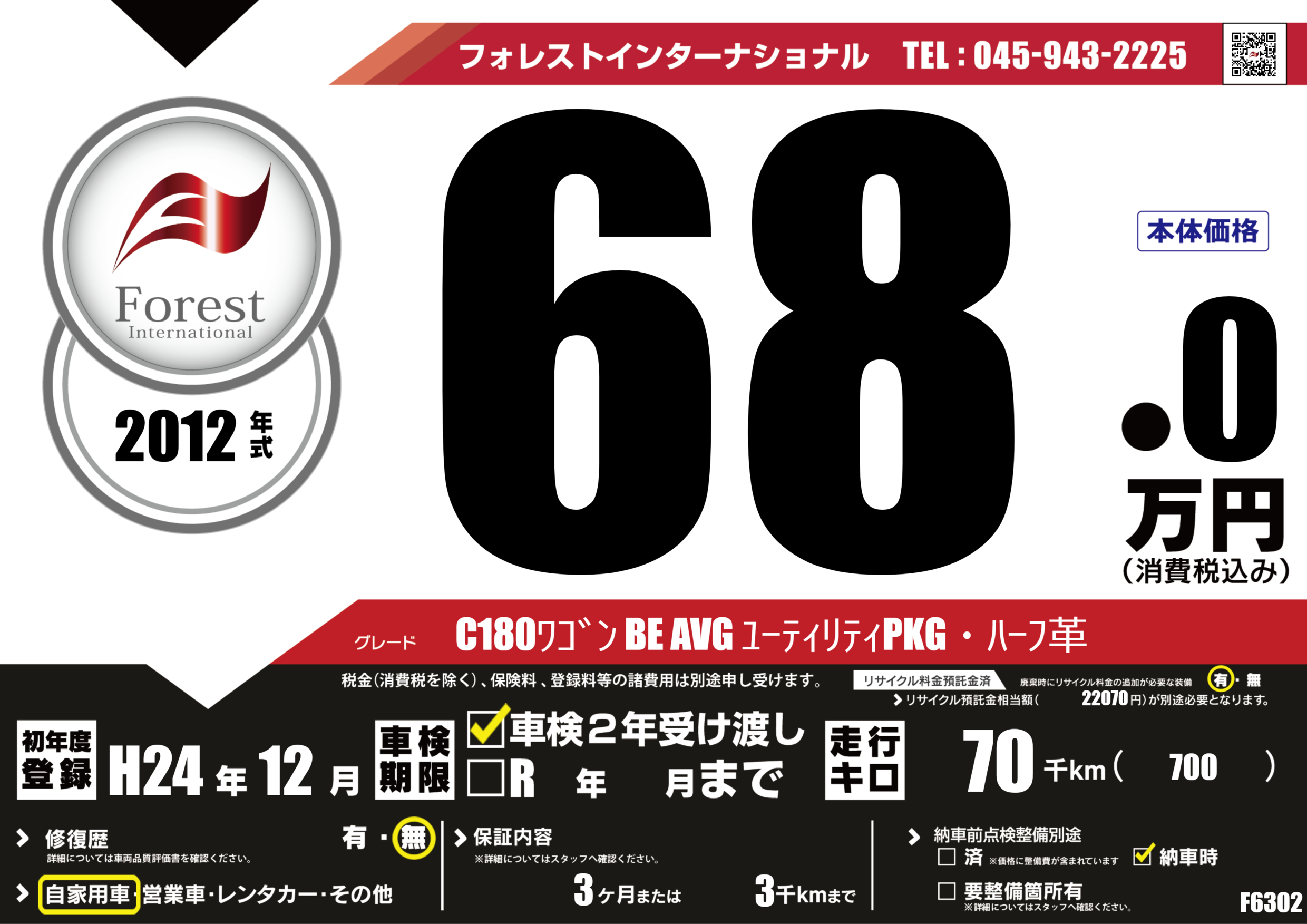 | 走行キロ | 7万km | 初年度登録 | H24年12月 |