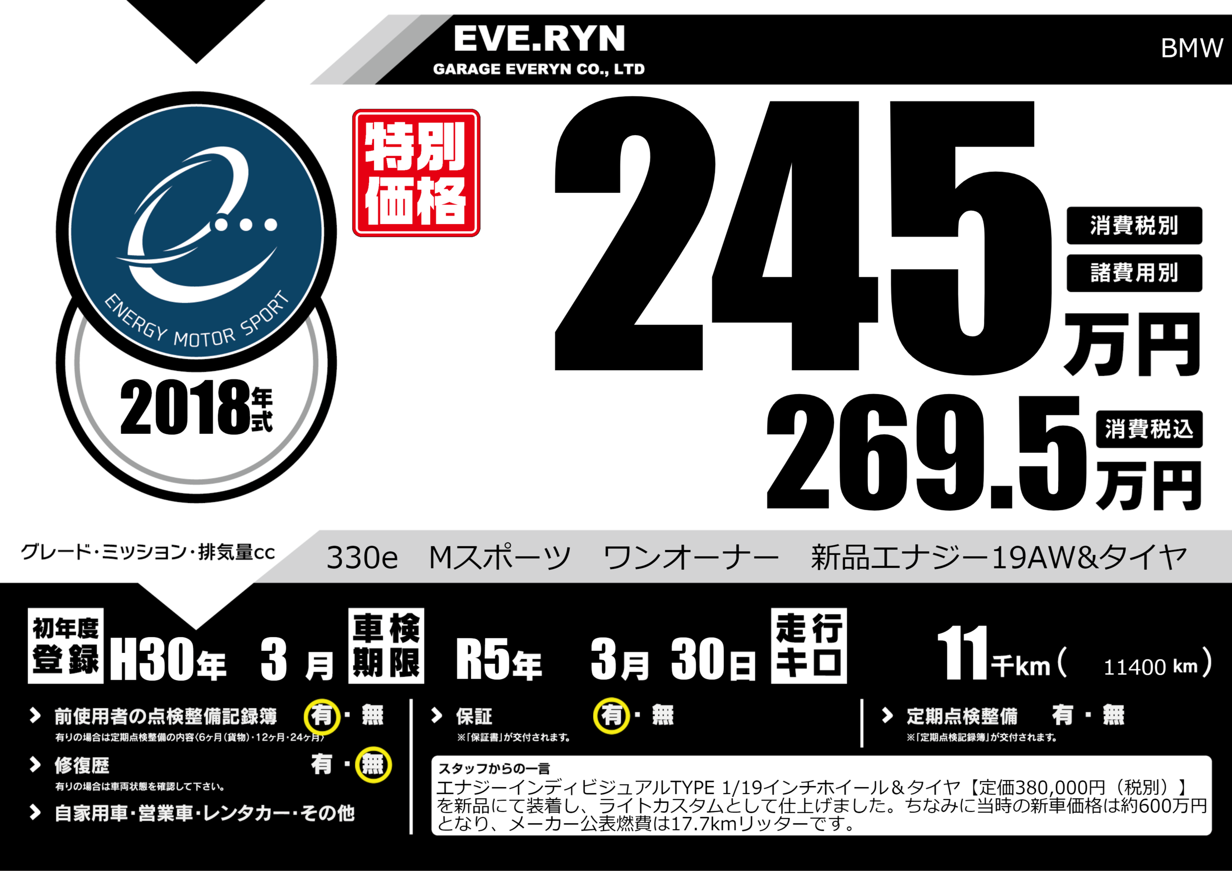 330e Mスポーツ ワンオーナー 新品エナジー19AW&タイヤ |
