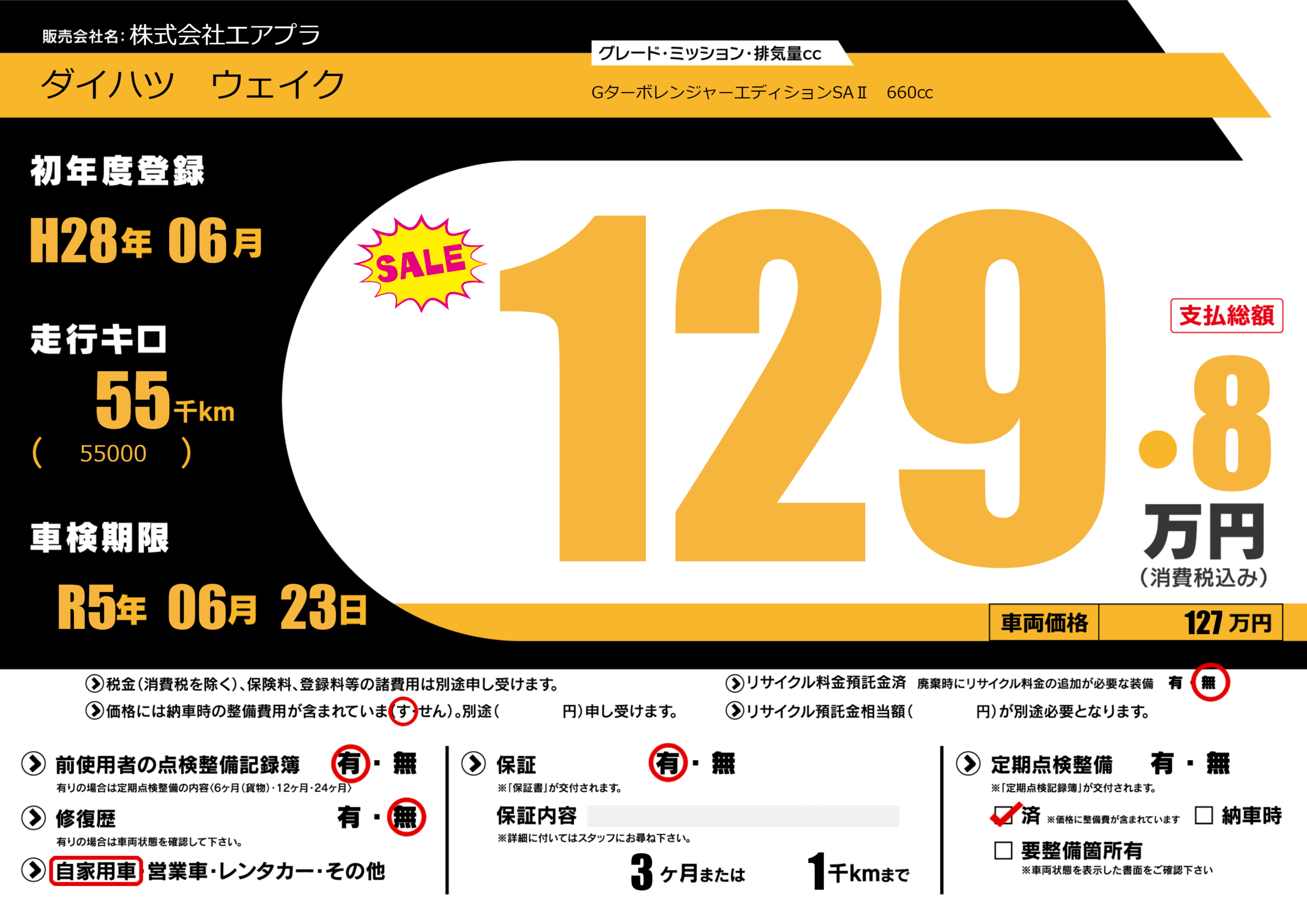 | 車名 | ダイハツ ウェイク | グレード ミッション 排気量 |