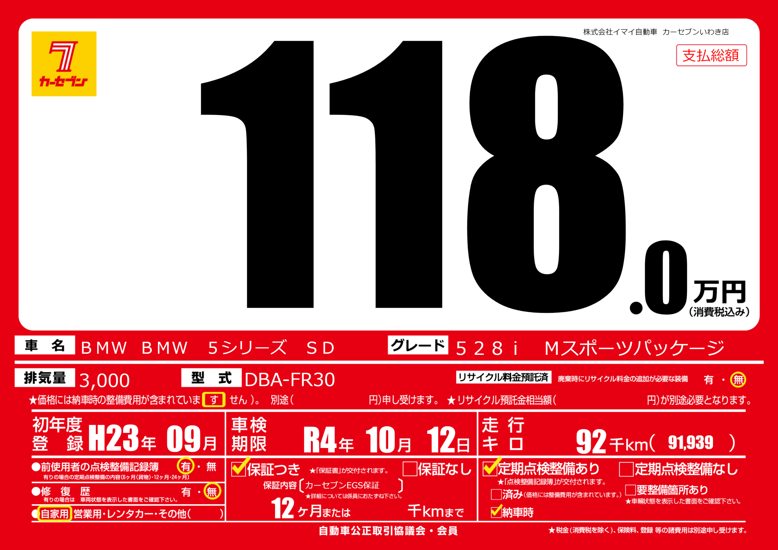 | 走行キロ | 9.2万km | 初年度登録 | H23年09月 |