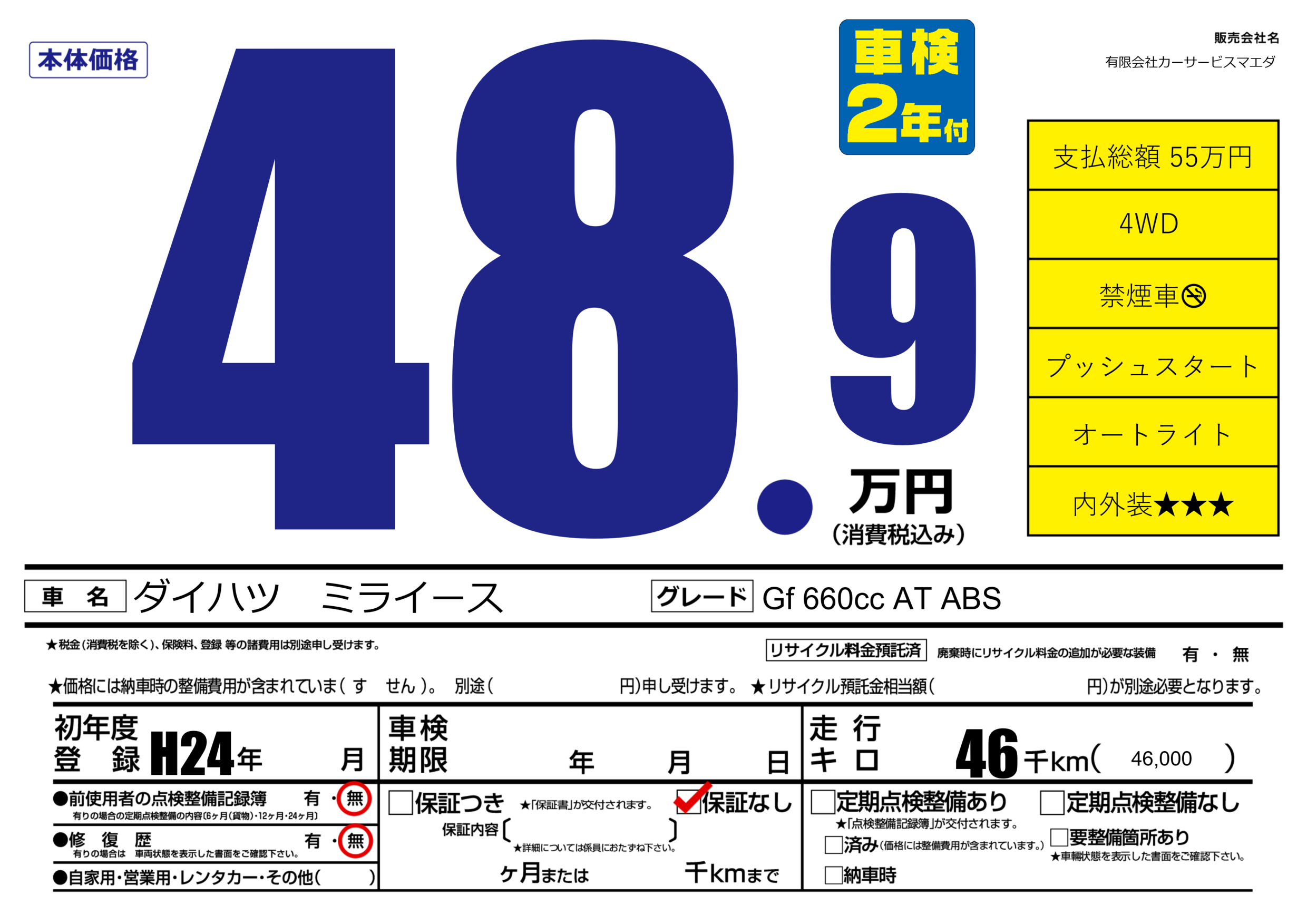 | 走行キロ | 4.6万km | 初年度登録 | H24年---月 |