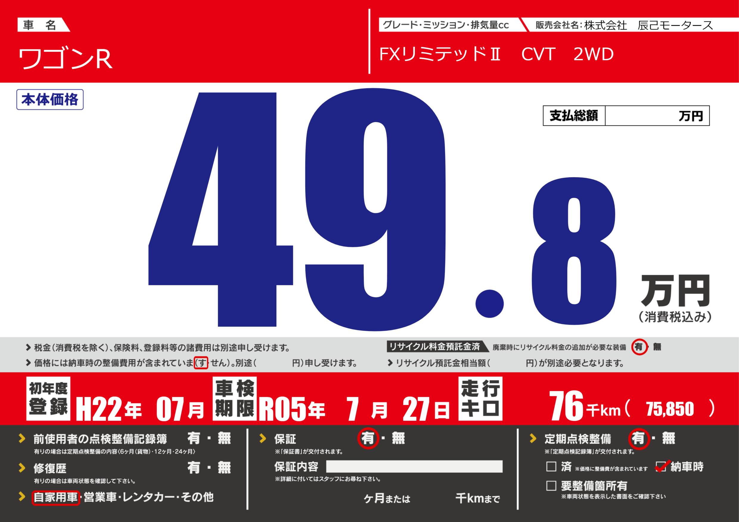 | 走行キロ | 7.6万km | 初年度登録 | H22年07月 |
