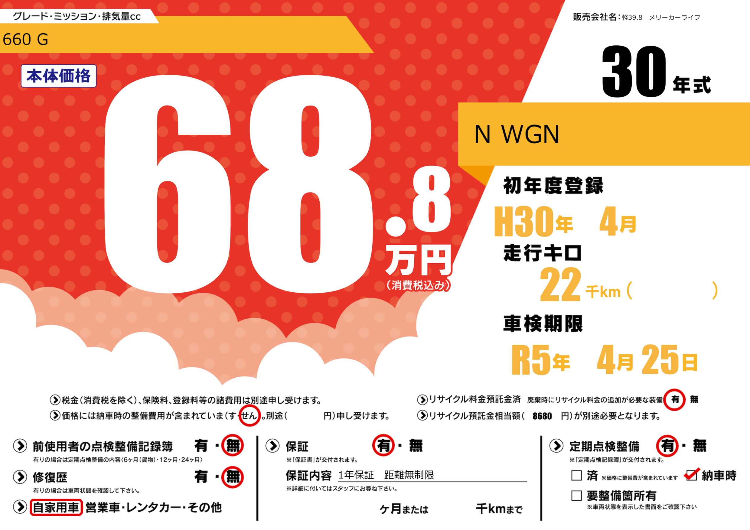 | 車名 | N WGN | グレード ミッション 排気量 |
