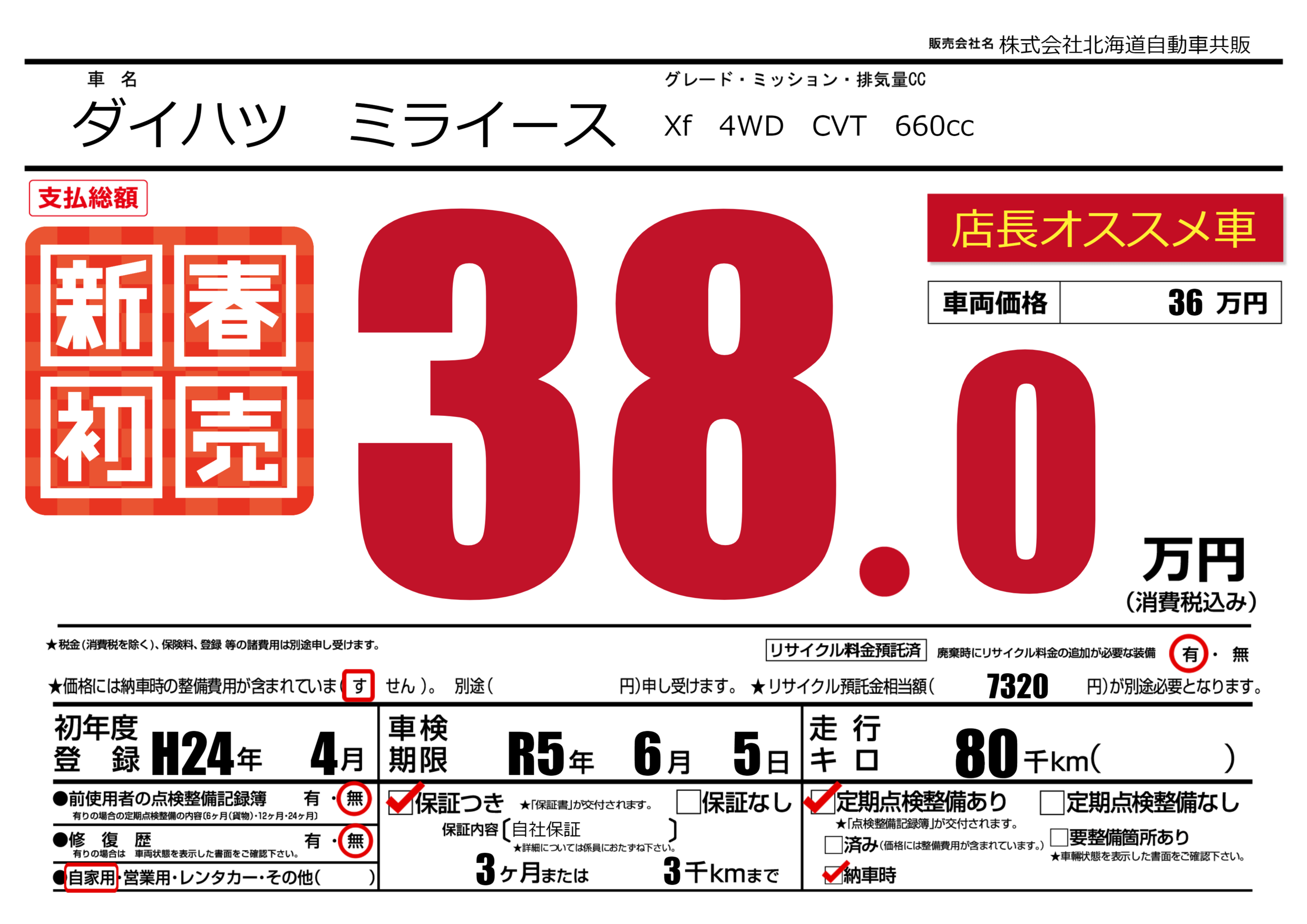 保証付き 保証内容(自社保証) 3ヶ月または3千km |
