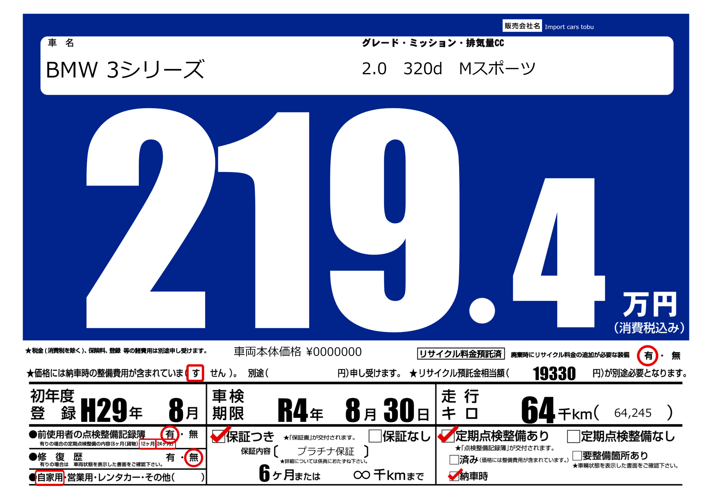 | 車名 | BMW 3シリーズ | グレード ミッション 排気量 |