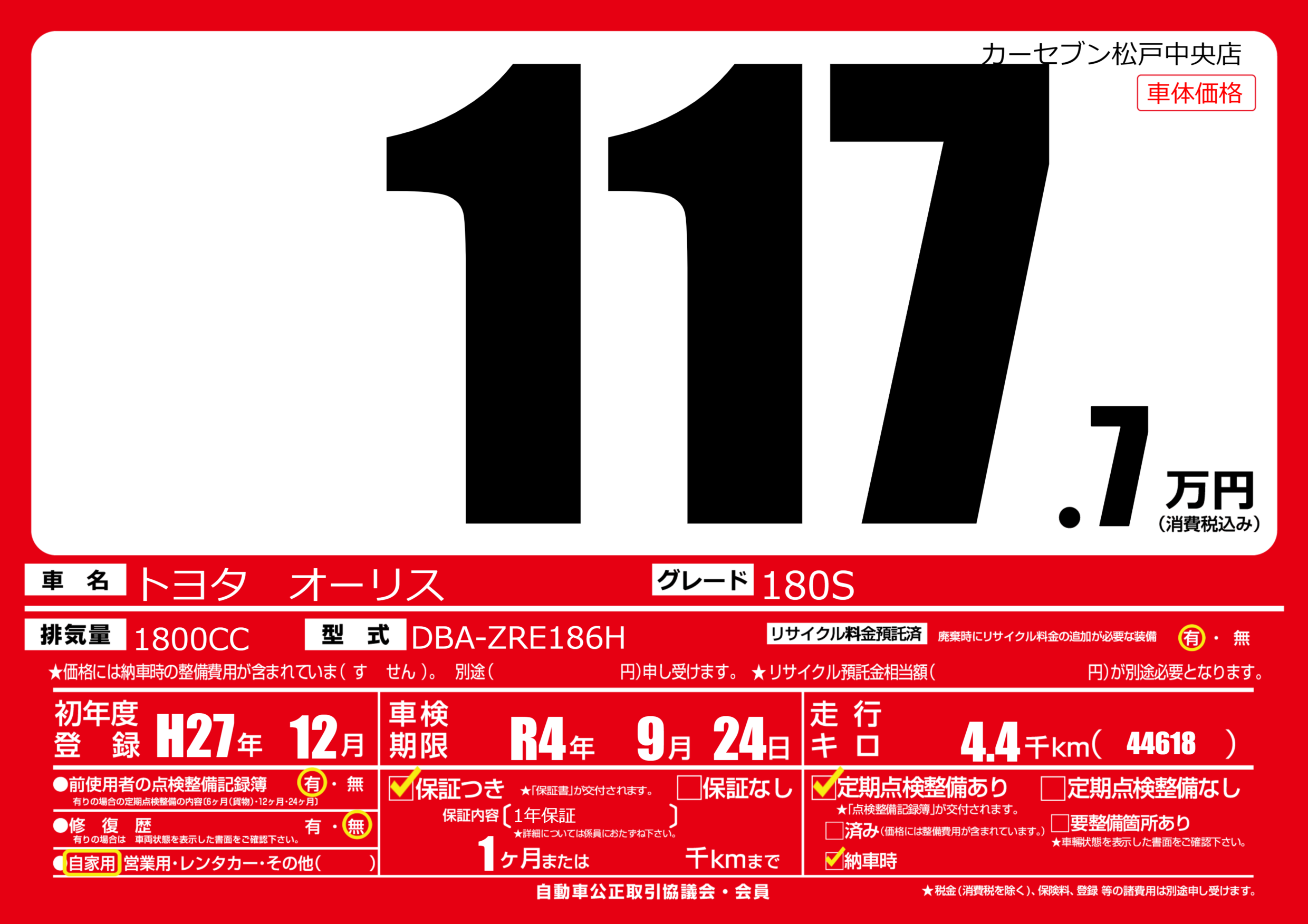| 車名 | トヨタ オーリス | グレード ミッション 排気量 |