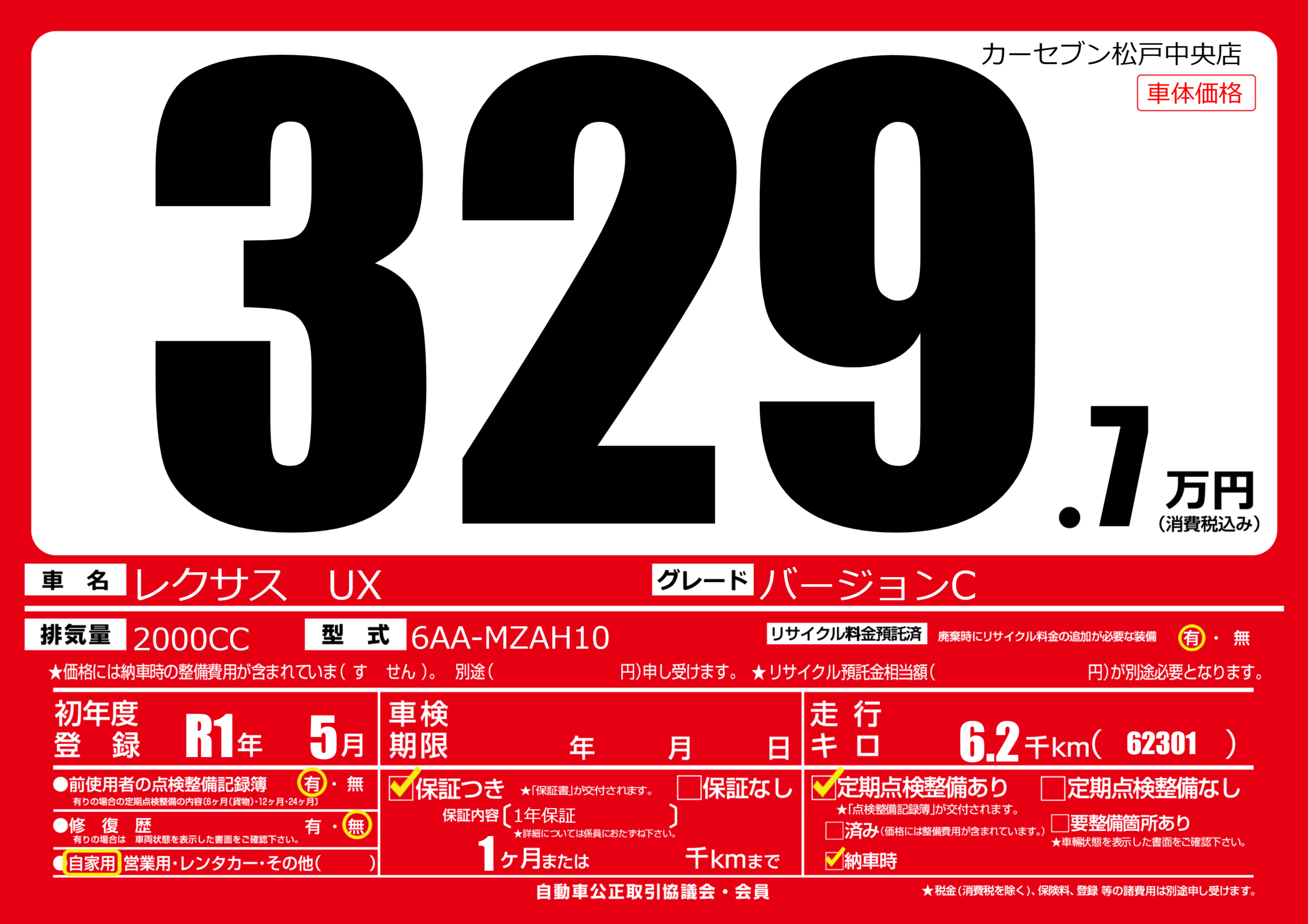 | 車名 | レクサス UX | グレード ミッション 排気量 |