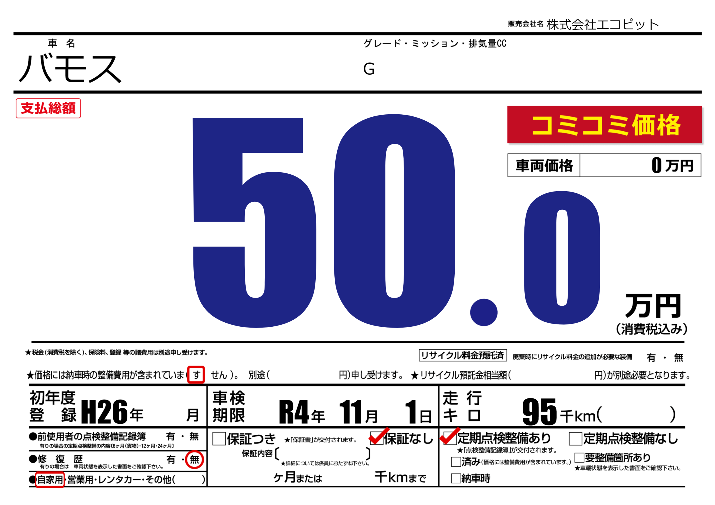 | 車名 | バモス | グレード ミッション 排気量 |