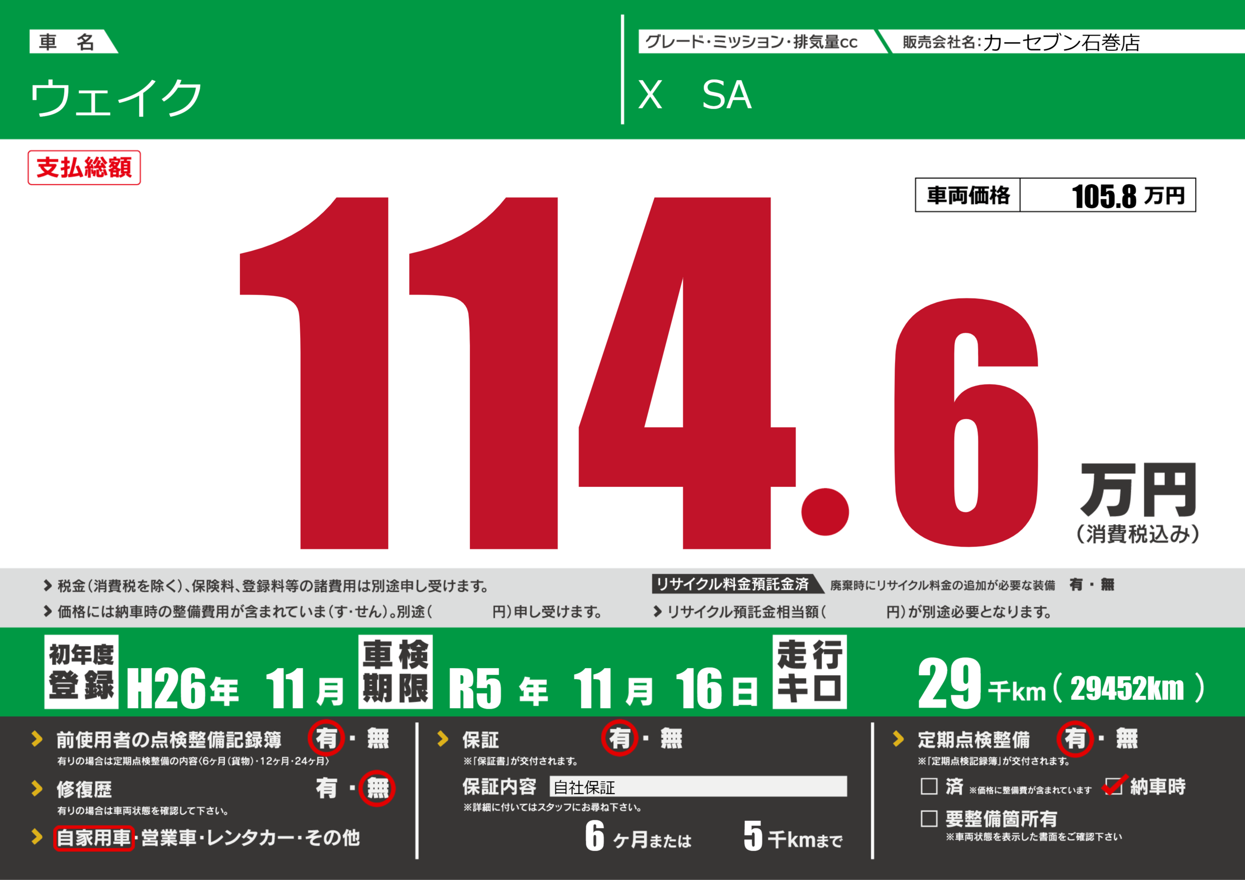 保証付き 保証内容(自社保証) 6ヶ月または(5)千kmまで |