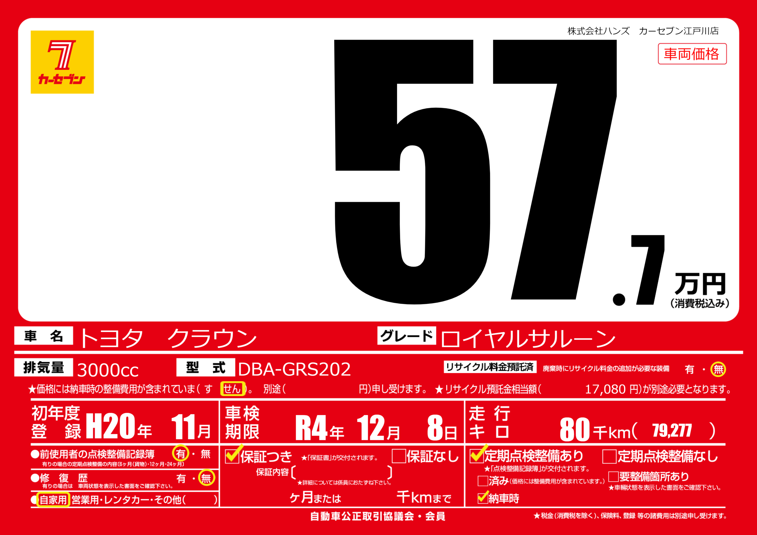 | 車名 | トヨタ クラウン | グレード ミッション 排気量 |