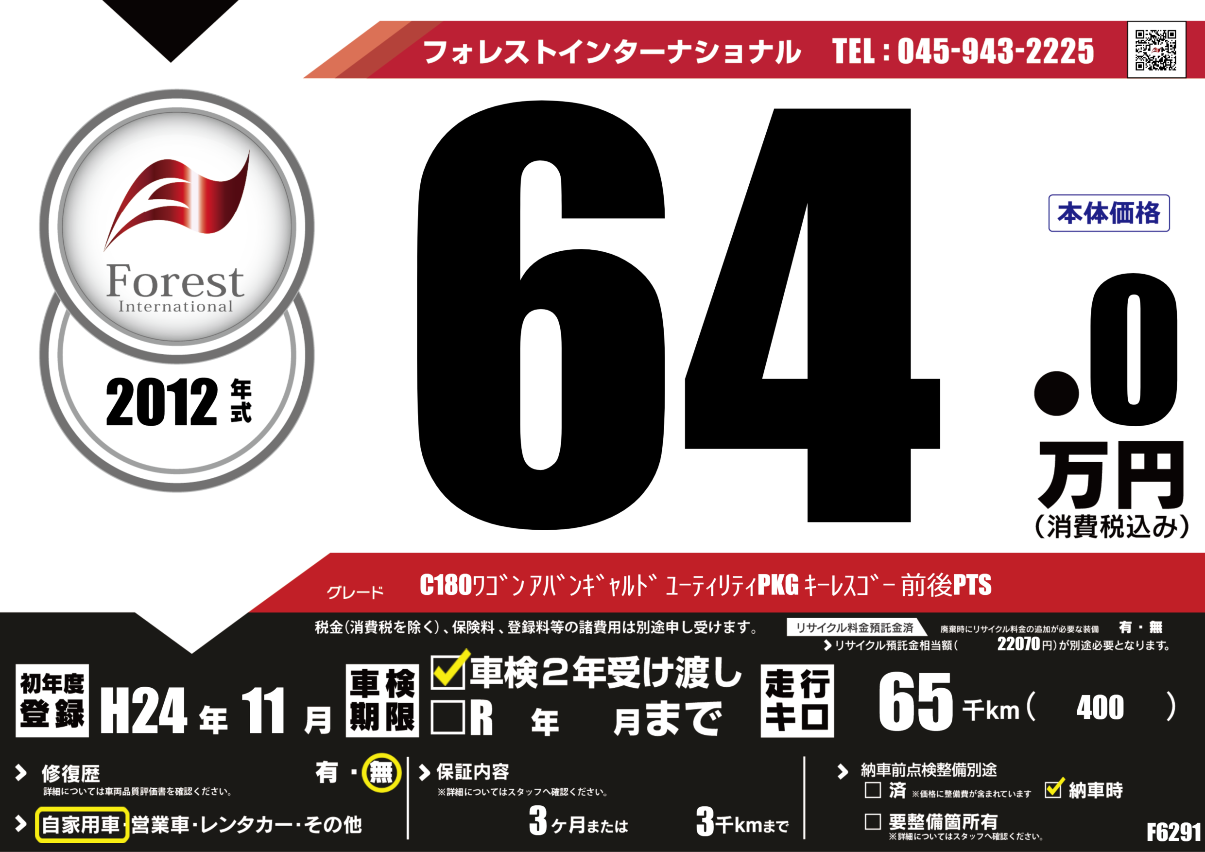 | 走行キロ | 6.5万km | 初年度登録 | H24年11月 |