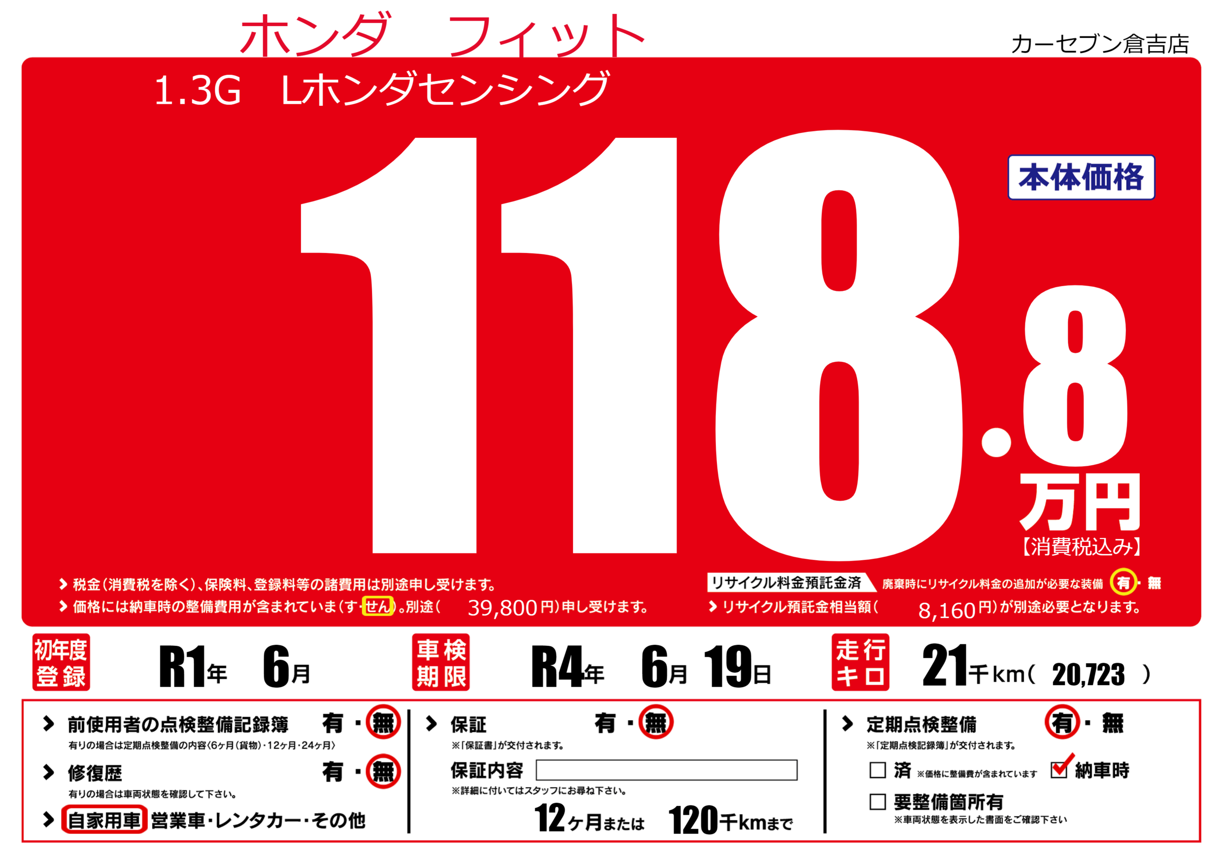 | 車名 | ホンダ フィット | グレード ミッション 排気量 |