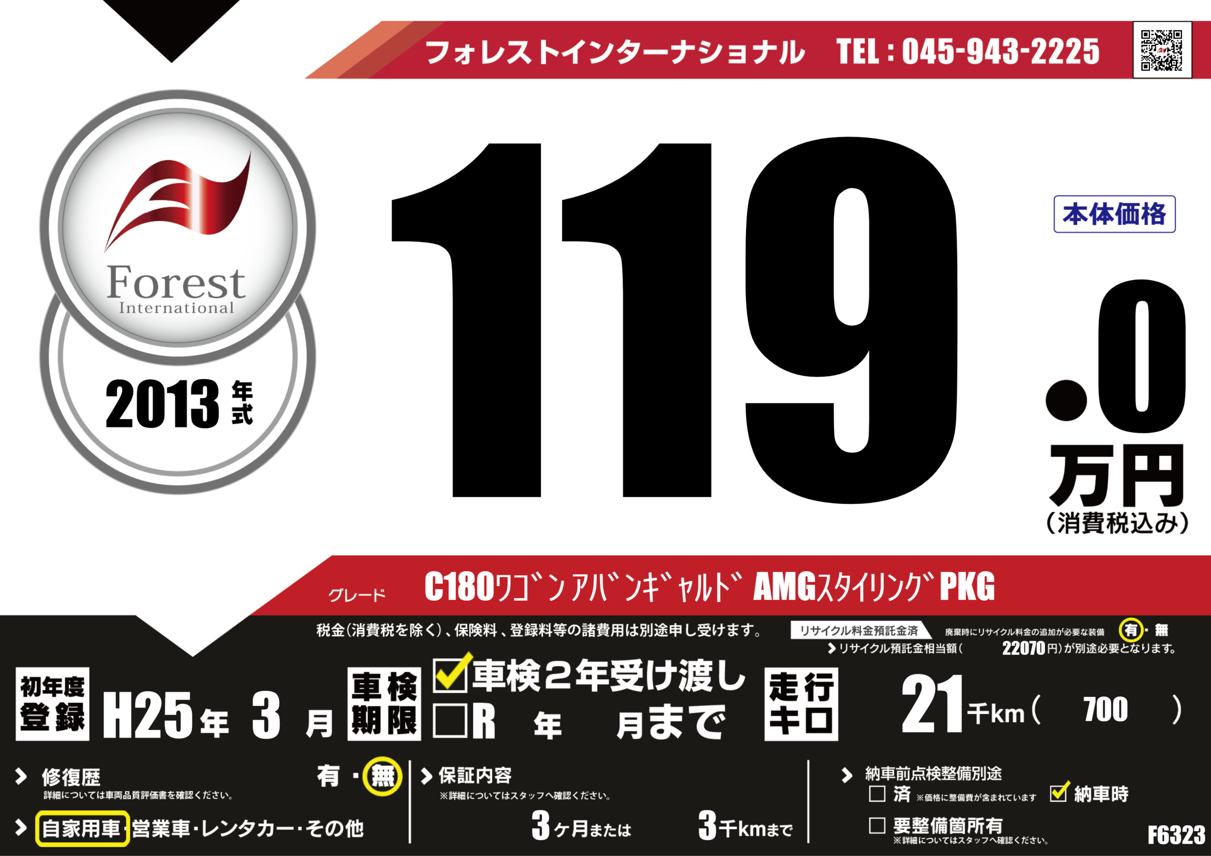 | 走行キロ | 2.1万km | 初年度登録 | H25年3月 |