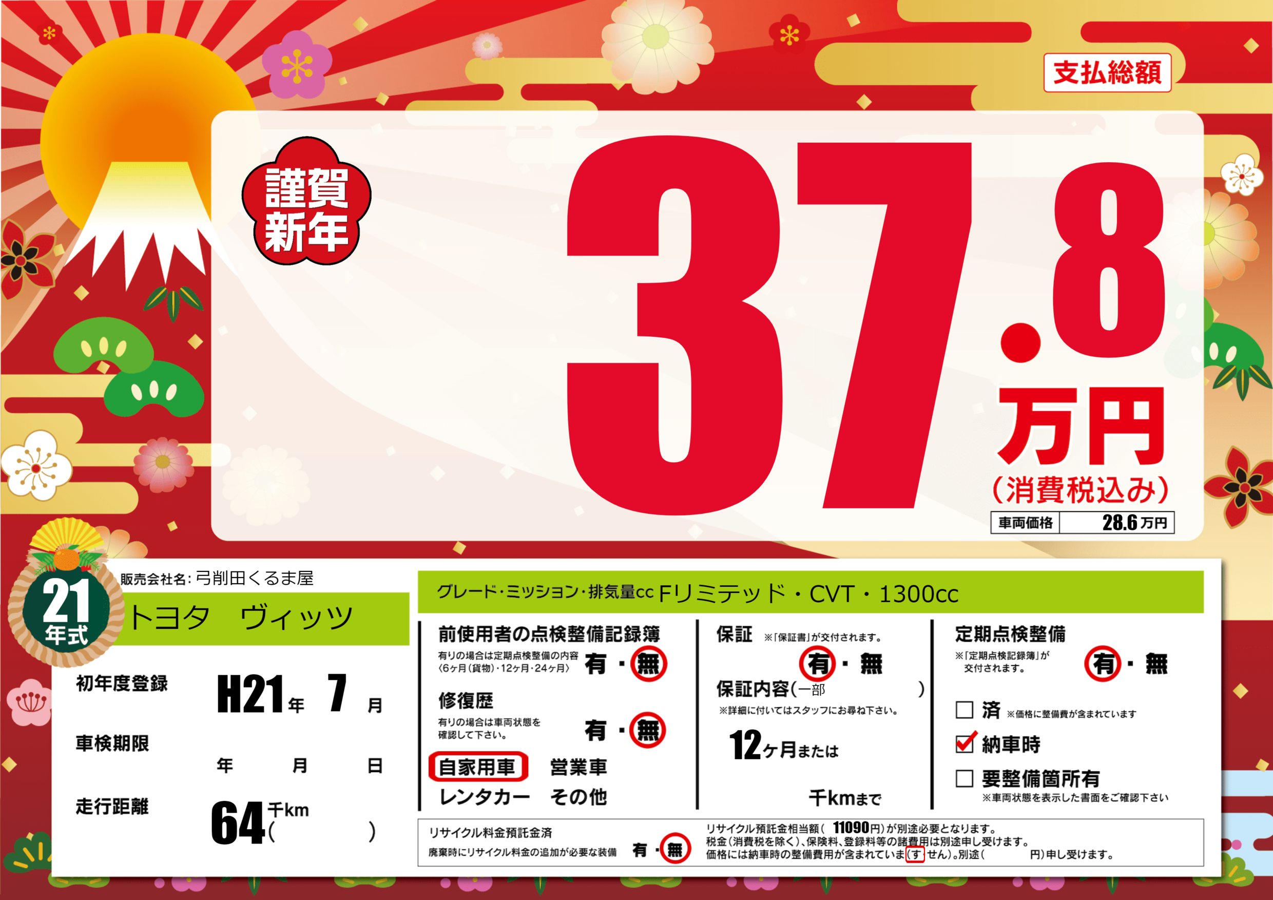 | 車名 | トヨタ ヴィッツ | グレード ミッション 排気量 |