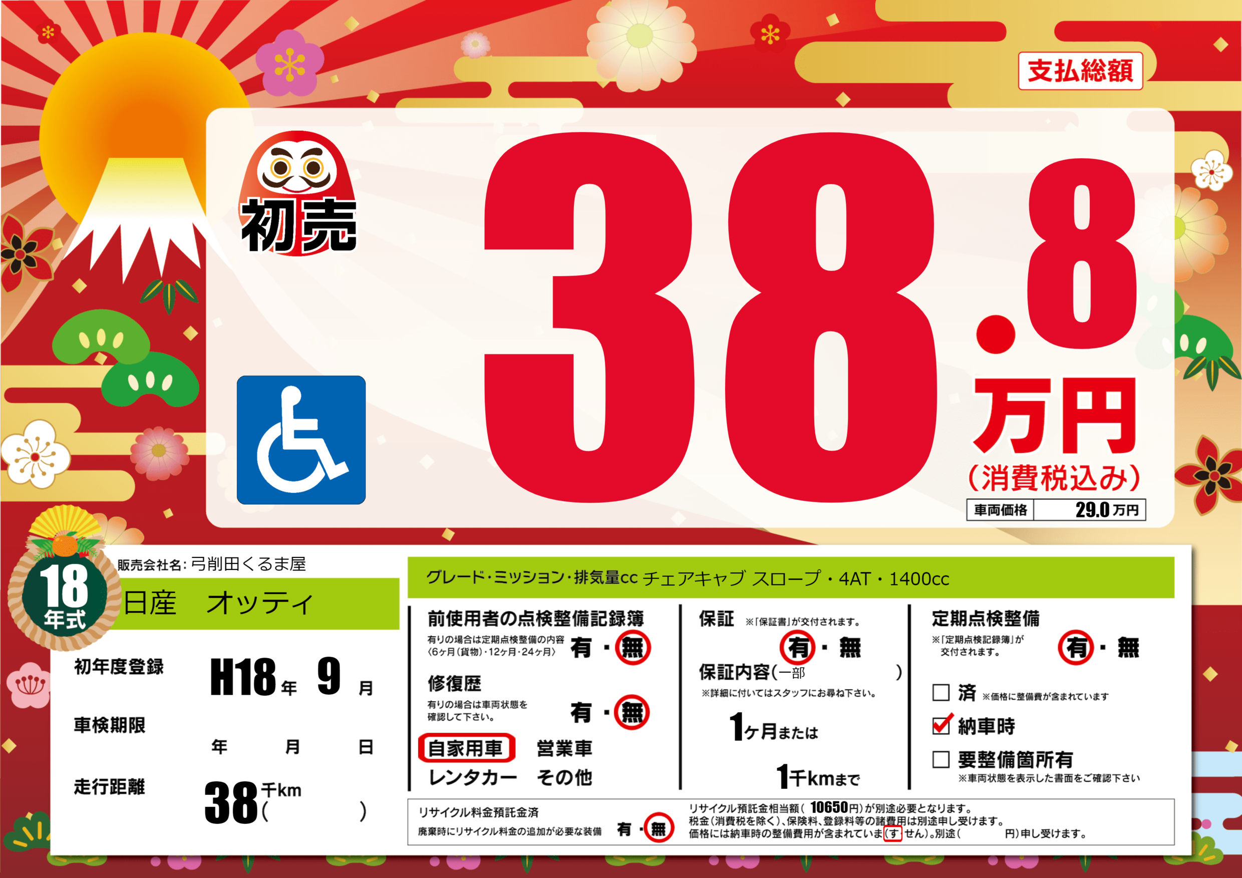 | 走行キロ | 3.8万km | 初年度登録 | H18年9月 |