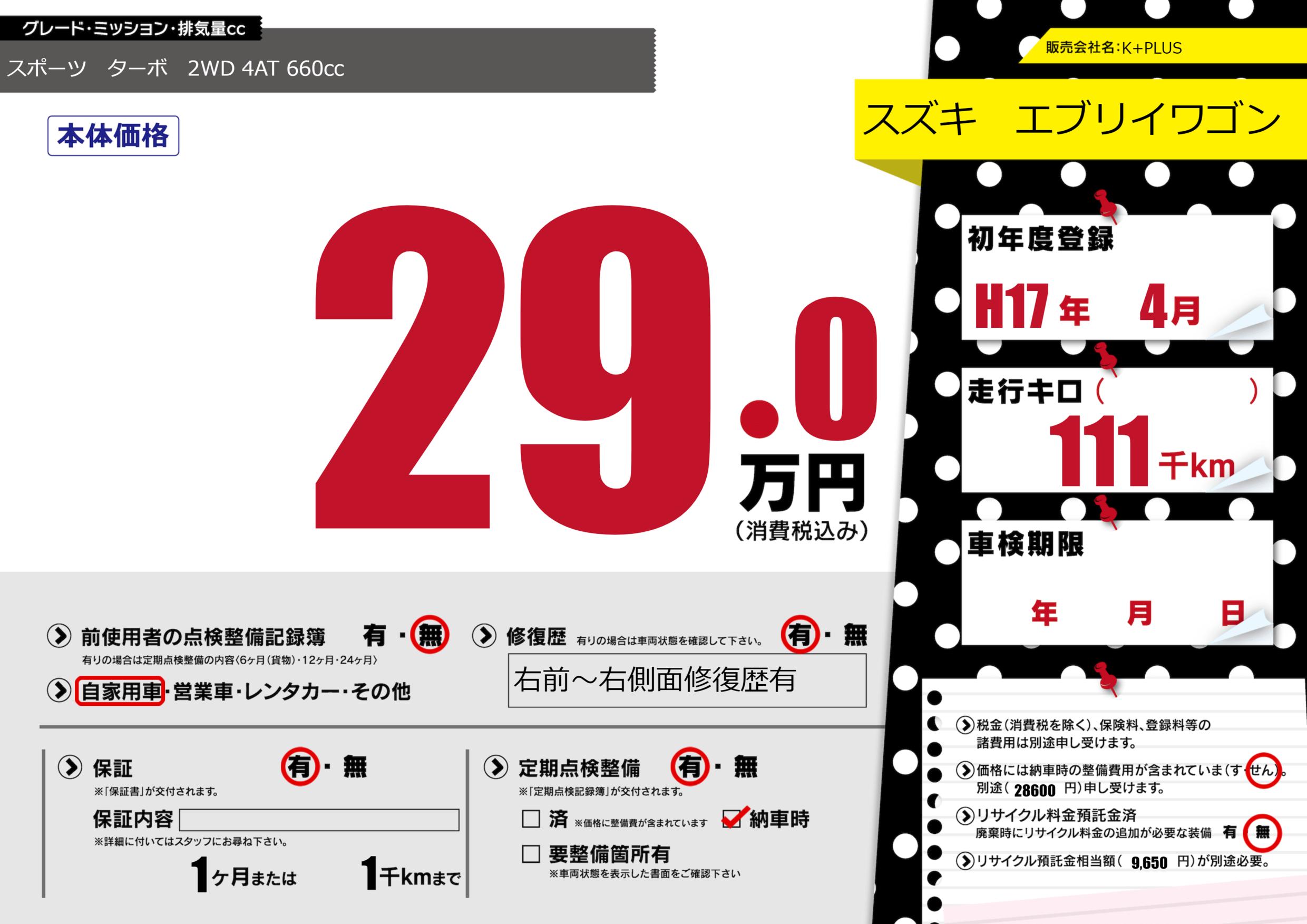 | 車名 | スズキ エブリイワゴン | グレード ミッション 排気量 |