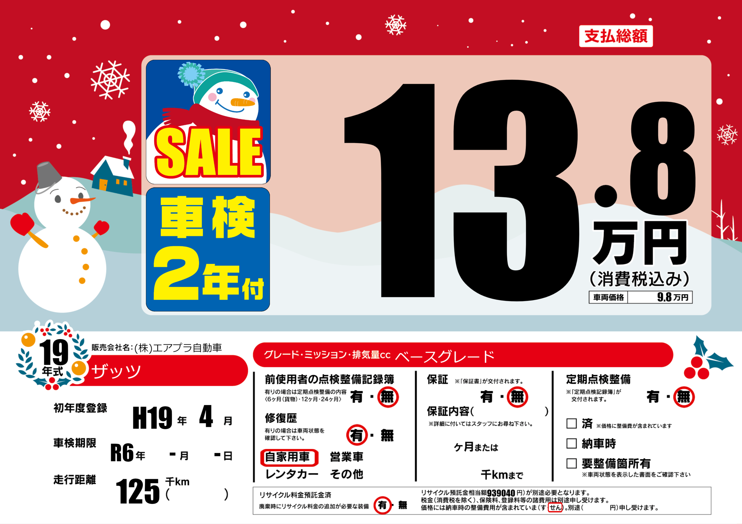 | 走行キロ | 12.5万km | 初年度登録 | H19年4月 |