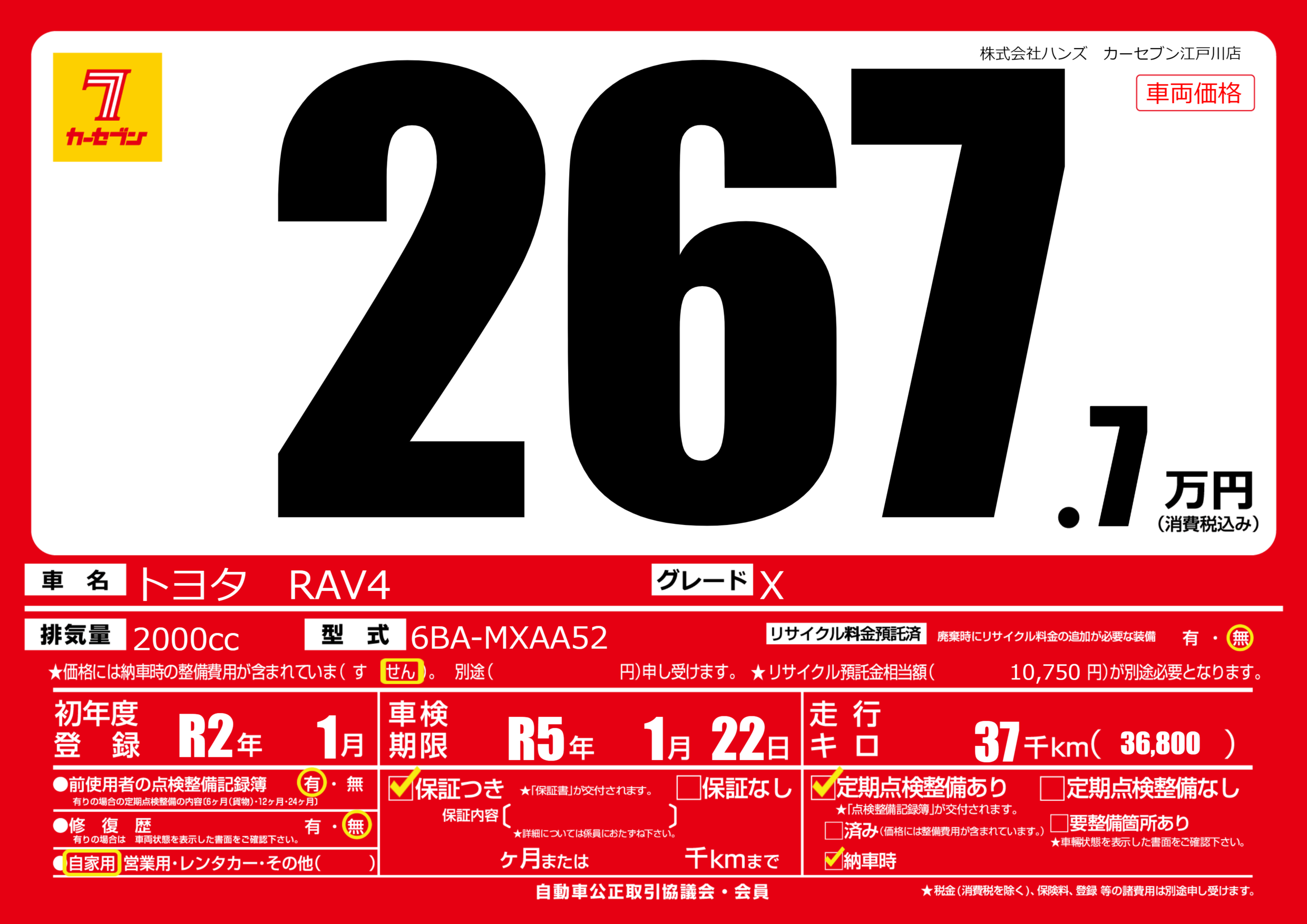 | 車名 | トヨタ RAV4 | グレード ミッション 排気量 |