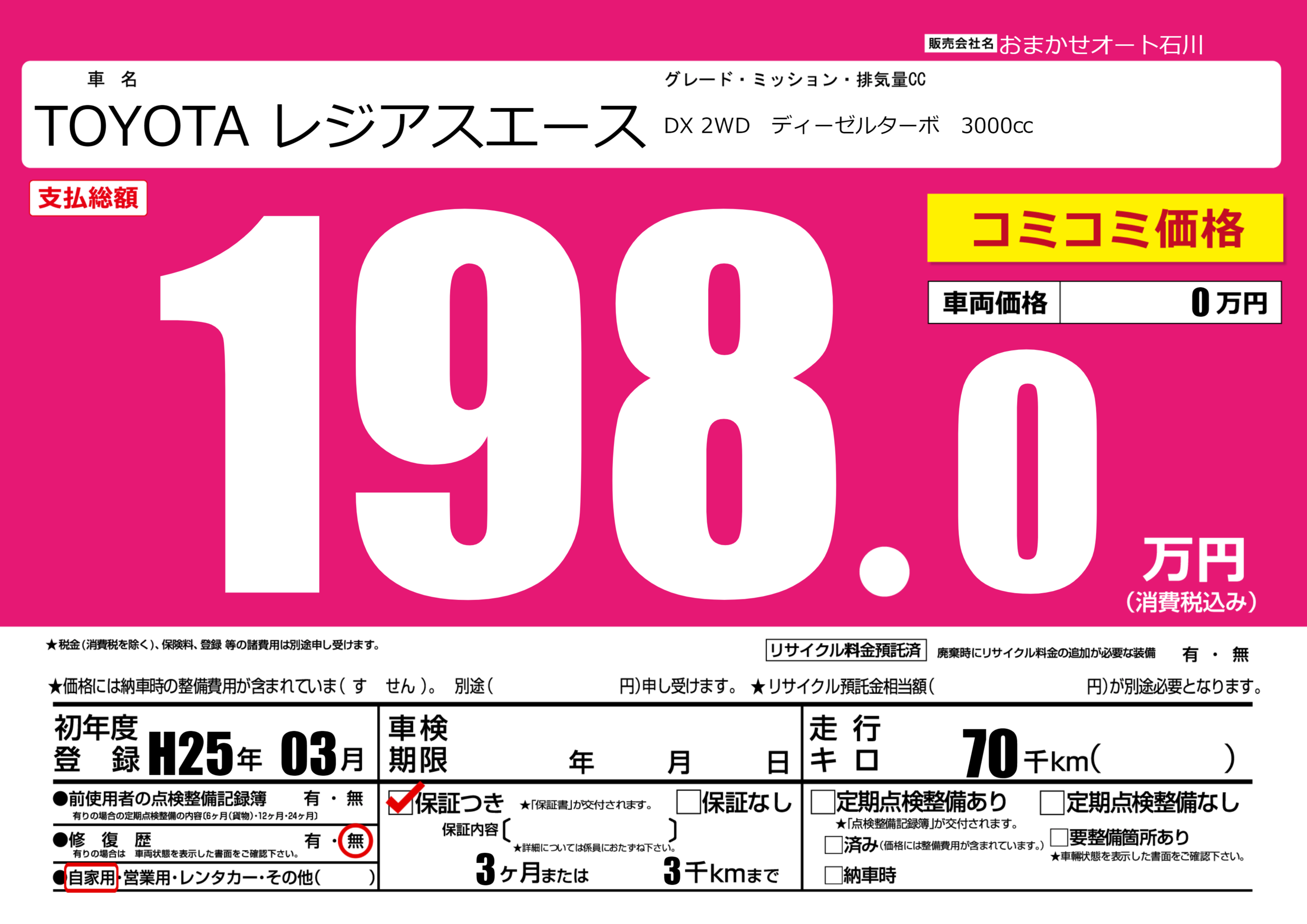 保証付き 保証内容(---) 3ヶ月または(3)千kmまで |
