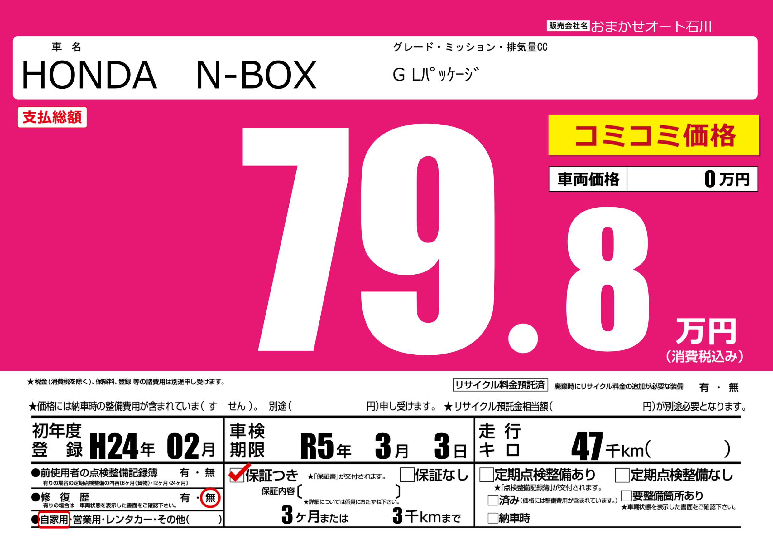 | 車名 | HONDA N-BOX | グレード ミッション 排気量 |