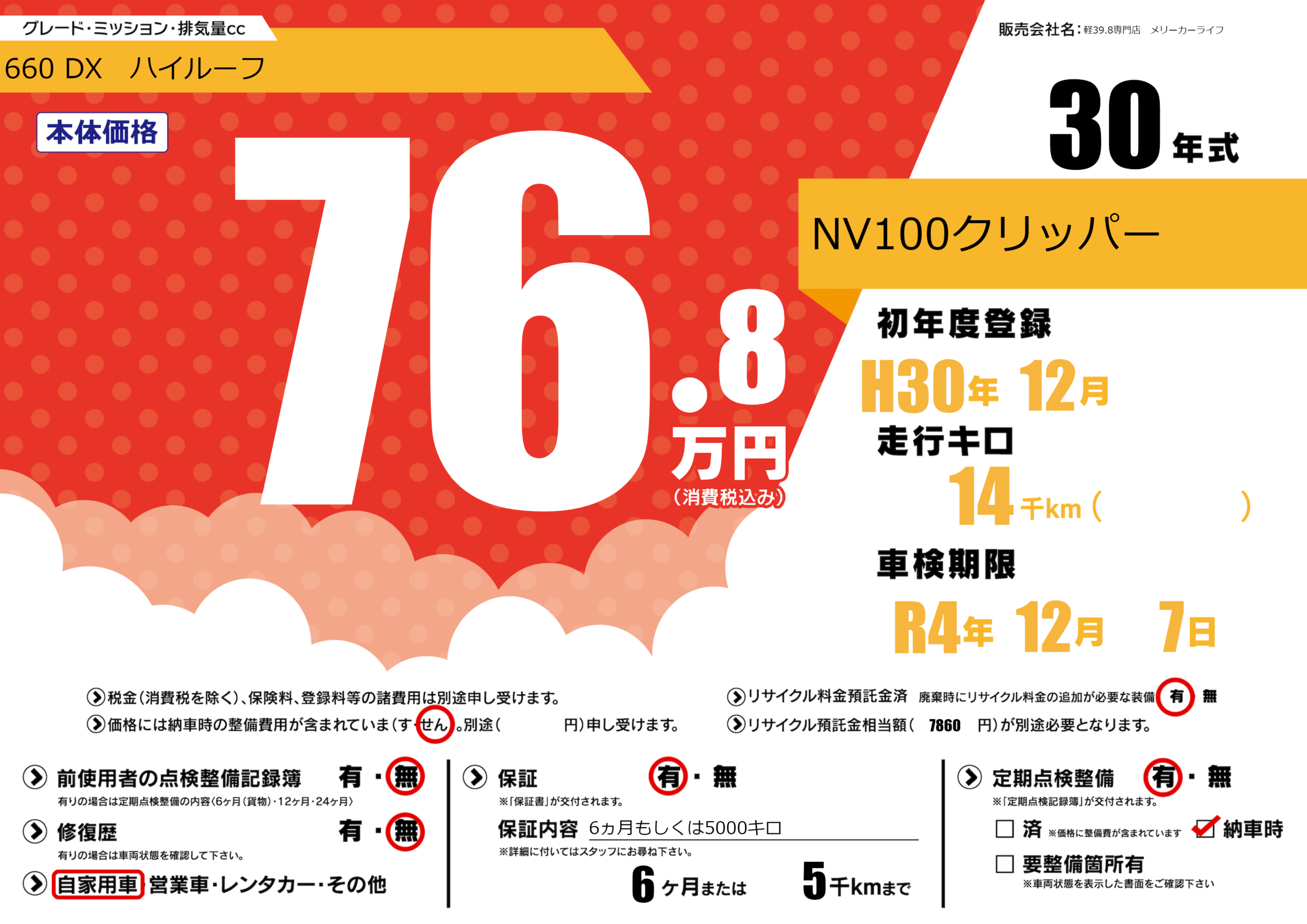 | 定期点検整備 | 定期点検整備あり 納車時あり | ||