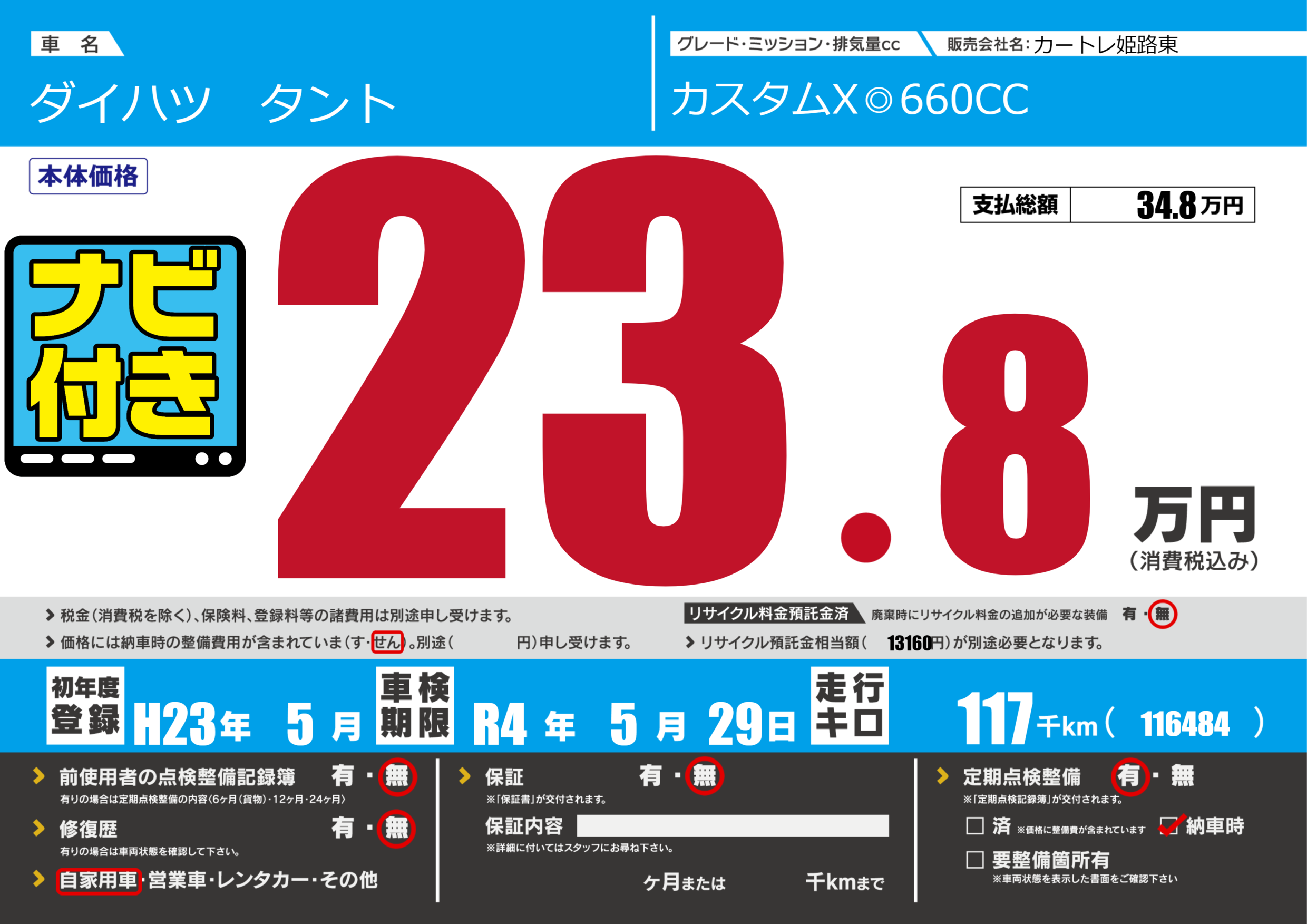 | 走行キロ | 11.7万km | 初年度登録 | H23年5月 |