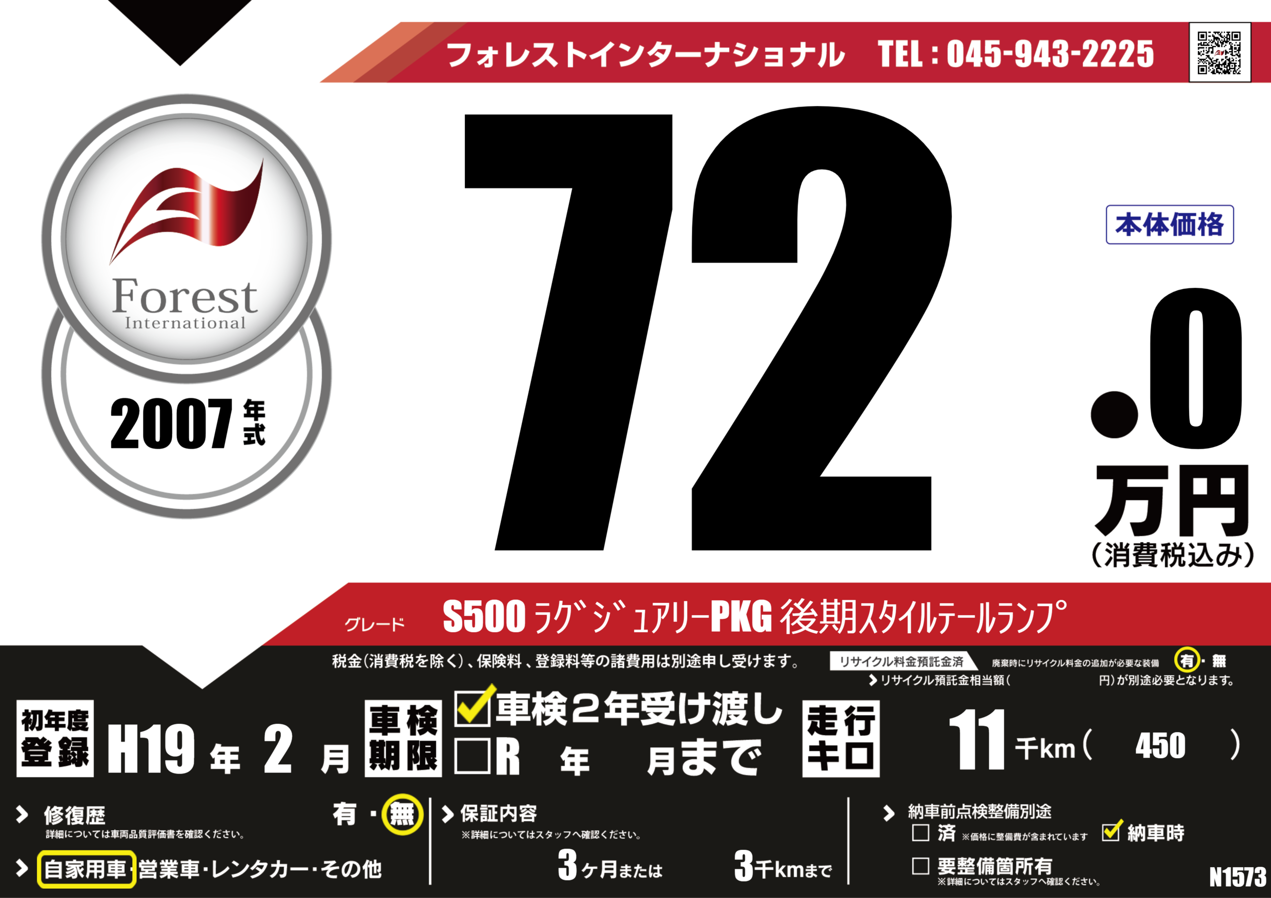 | 走行キロ | 1.1万km | 初年度登録 | H19年2月 |