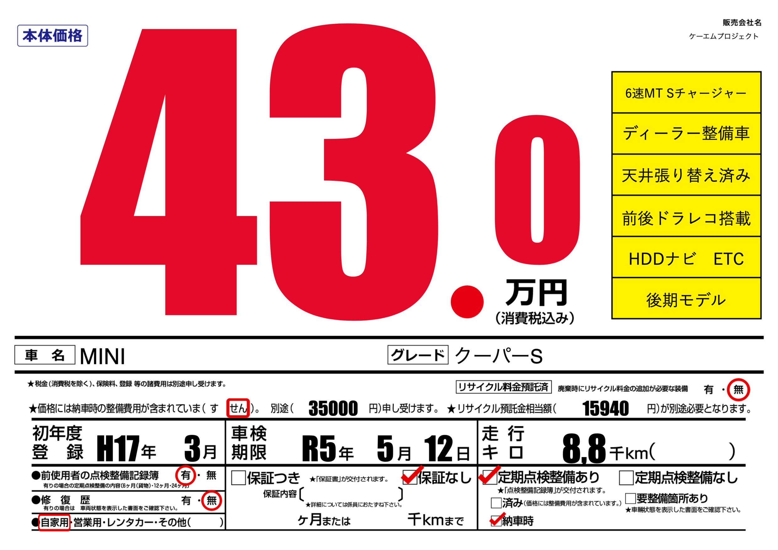 | 走行キロ | 0.8万km | 初年度登録 | H17年3月 |