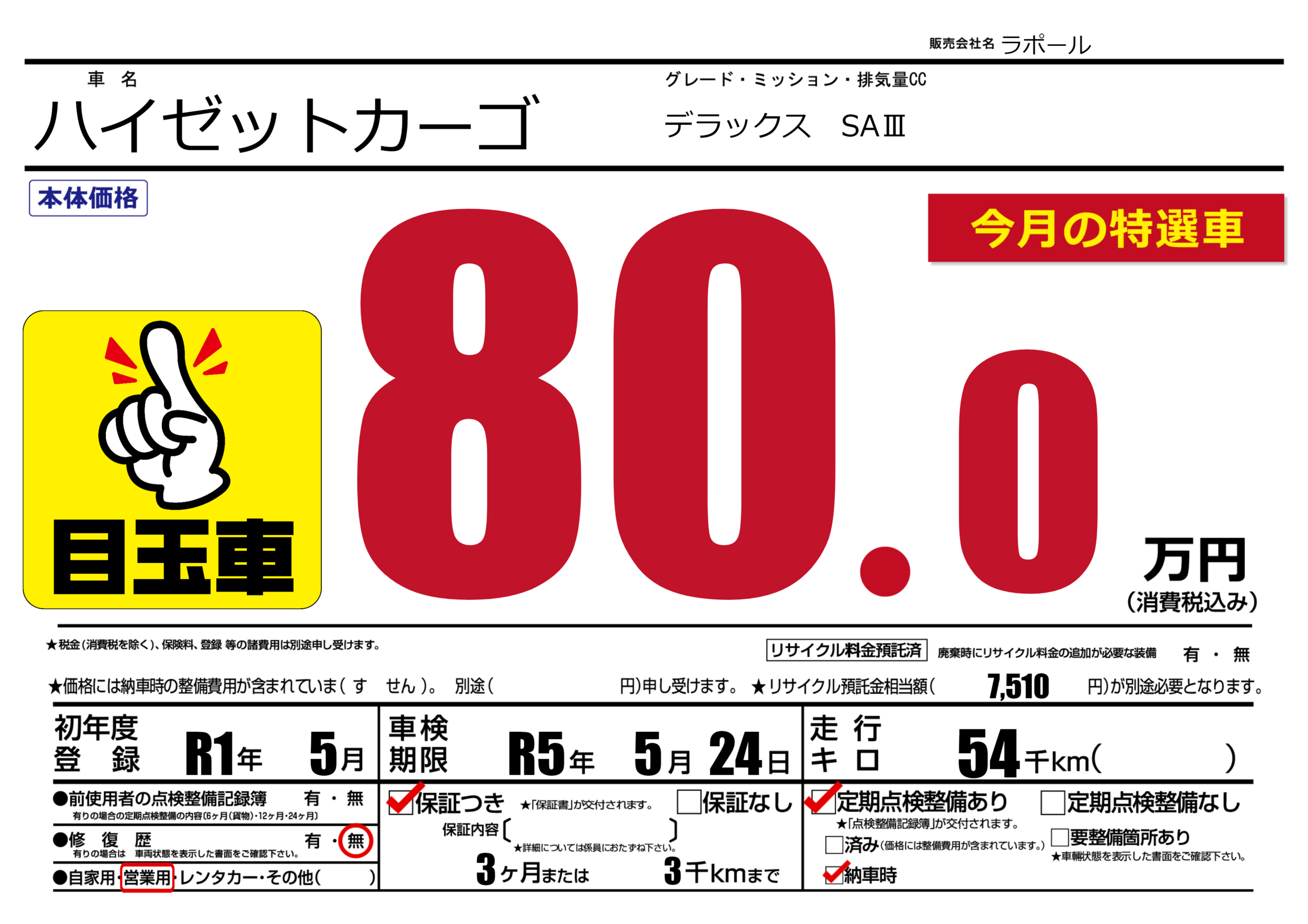 保証付き 保証内容(---) 3ヶ月または(3)千kmまで |