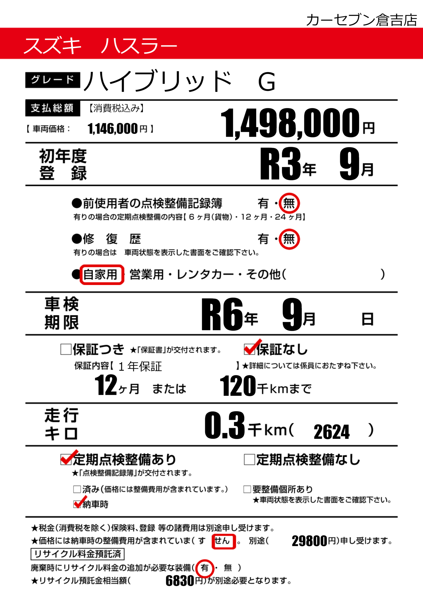 | 車名 | スズキ ハスラー | グレード ミッション 排気量 |